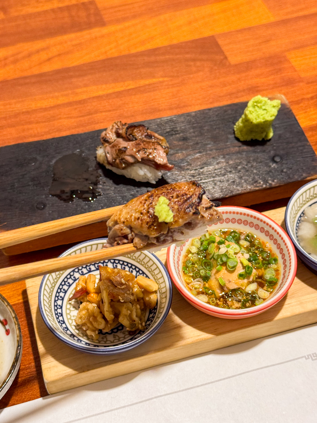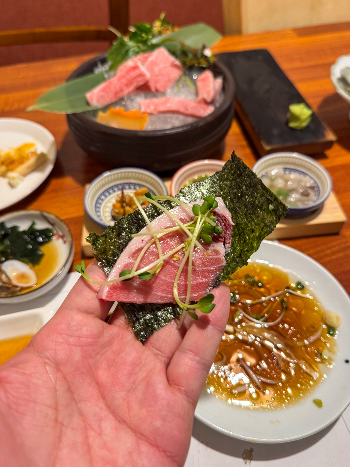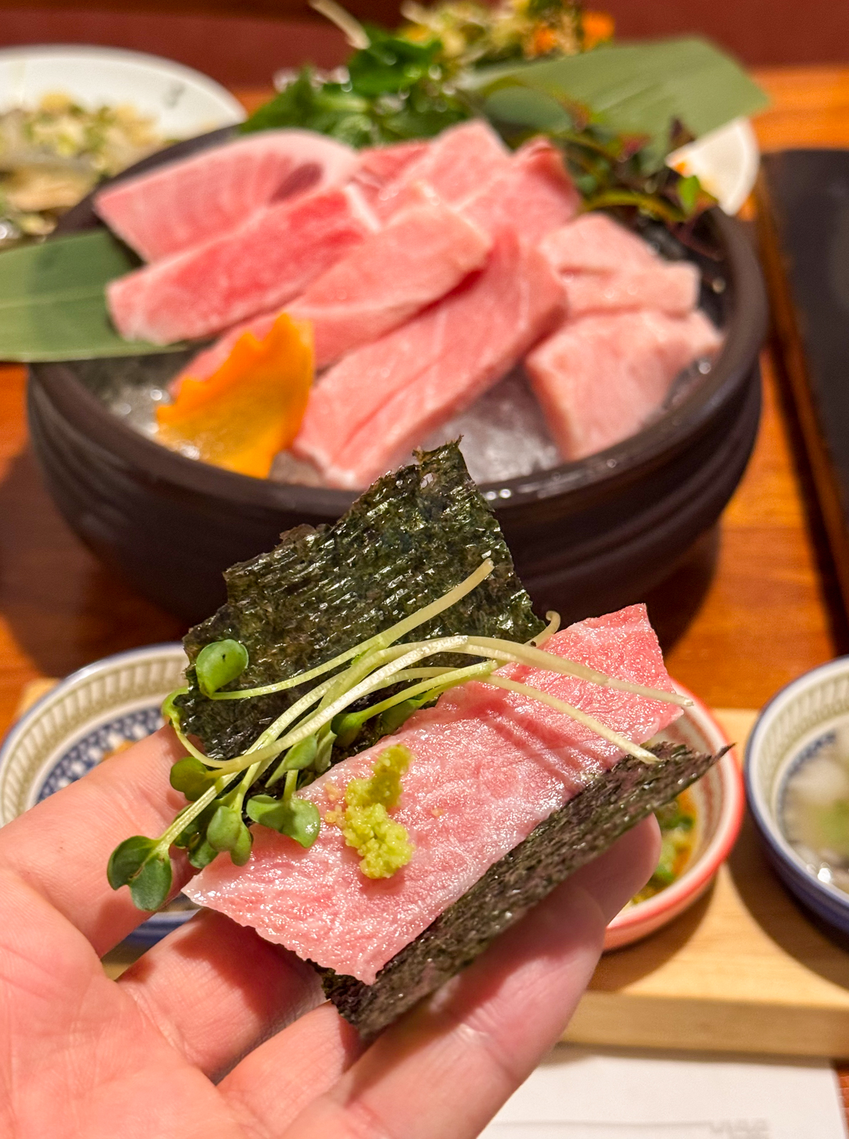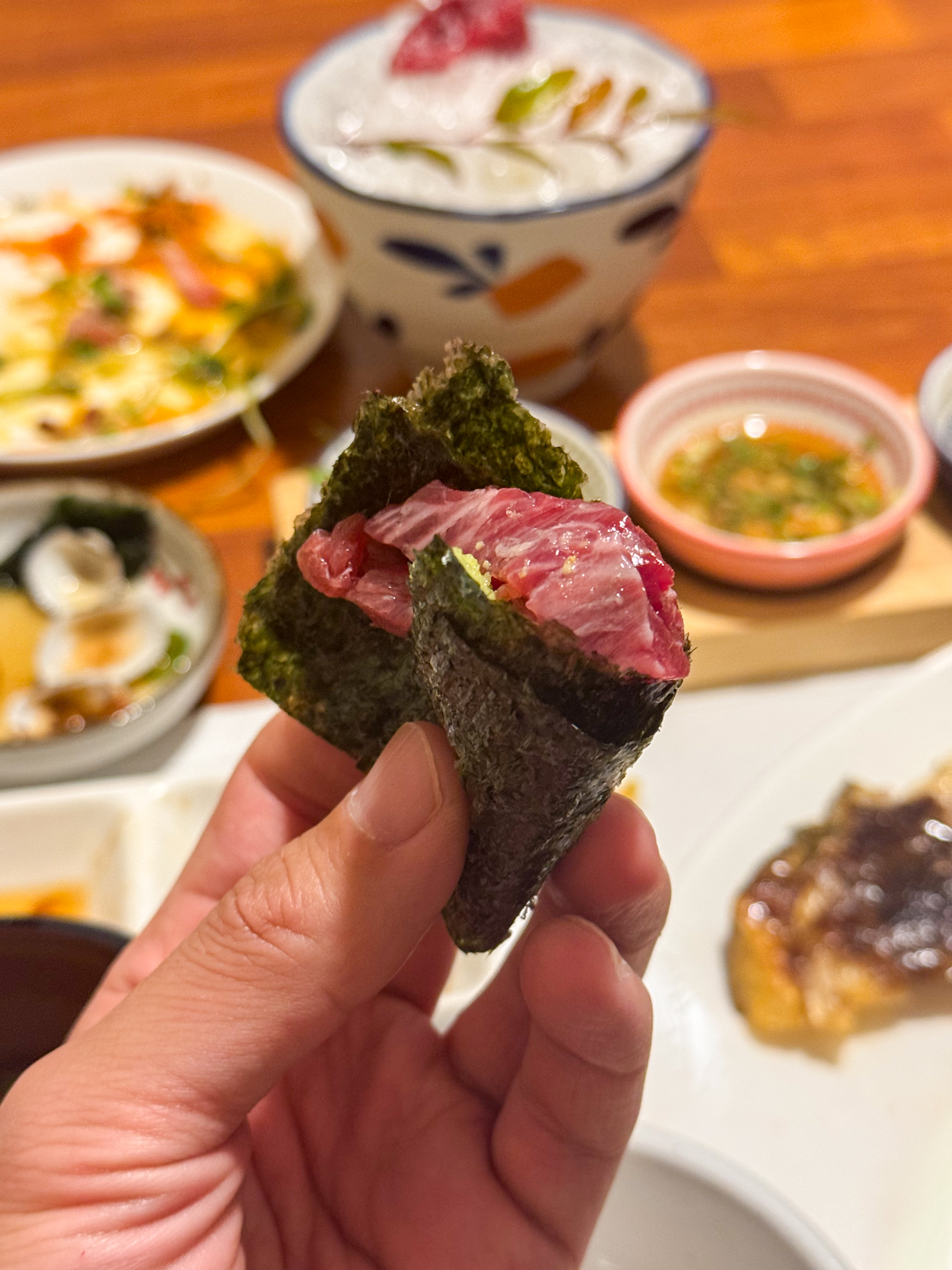 김용복참치에서 본격적으로 참치회를 먹기 전에 다른 요리와 함께 나왔던 참치 타다끼 초밥은 노릇노릇하게 구워 담백했고 생와사비가 포함되어 입맛을 돋궈줬다.