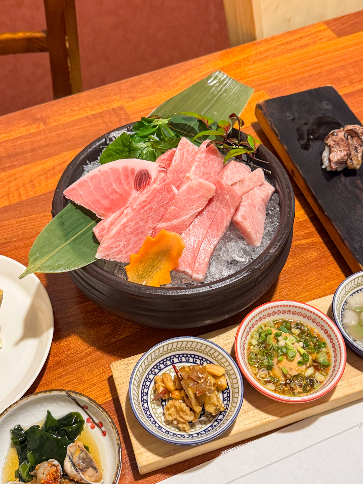이날 김용복참치에서 맛본 1인 가격 48,000원짜리 프리미엄 코스에는 참치샐러드, 복껍질무침, 타코와사비, 호두강정, 돼기고기 목살 육전, 참치 타다끼 초밥, 미역 꼬막무침, 간장새우, 참치회(스나즈리, 오도로, 주도로, 가마도로) 등 신선한 요리가 포함되어 있다.