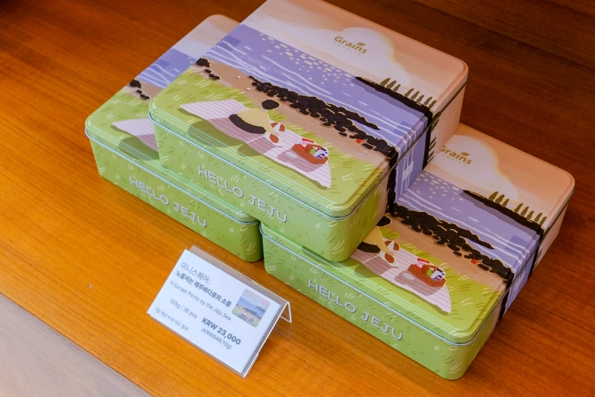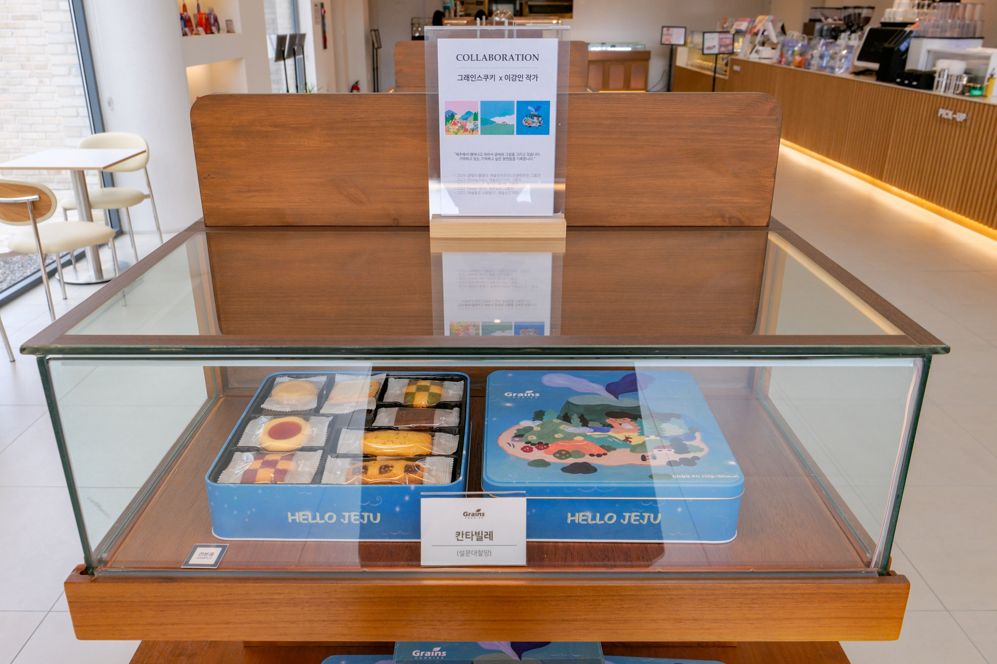 제주도 기념품 추천 카페에는 제주도에서 활동하는 화가 분들이 직접 참여한 그래인스쿠키 틴케이스 제품도 만나볼 수 있었다. 제주의 바다와 풍경을 일러스트로 표현한 디자인이 눈길을 끌었는데 인테리어 소품으로 활용해도 될 만큼 고급스러우면서 예뻤다.