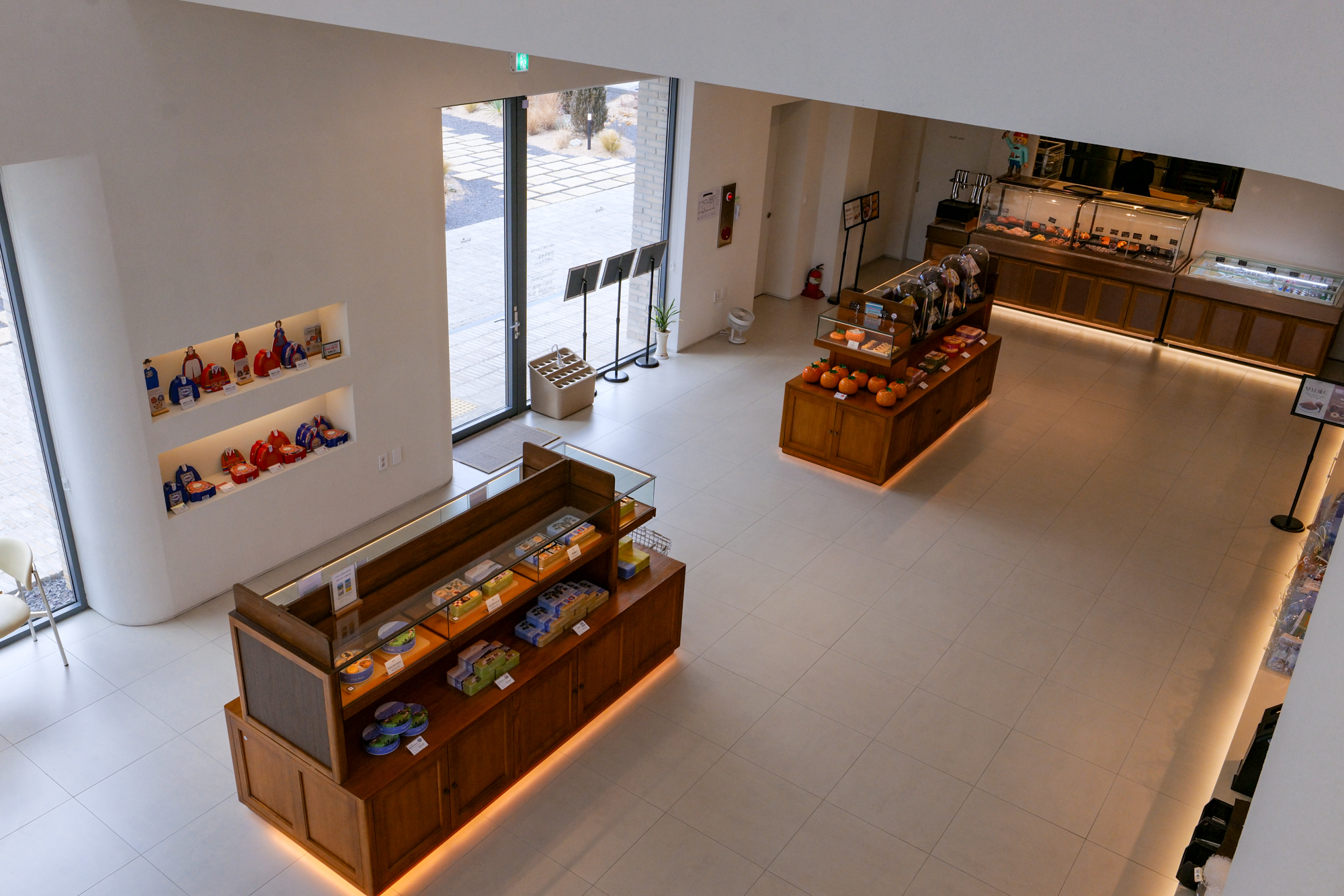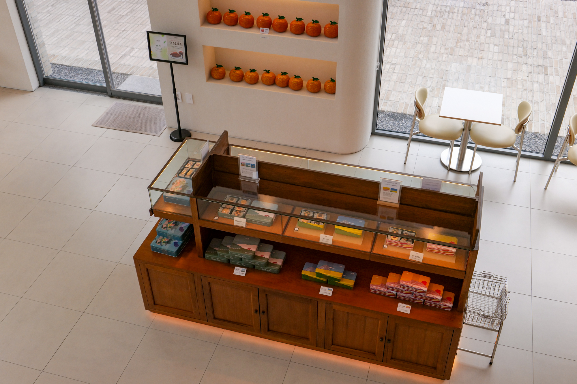 제주 애월 카페 그래인스쿠키는 카운터와 다양한 쿠키 선물세트, 테이블이 있는 1층과 함께 전망대와 넓은 공간을 자랑하는 2층 공간으로 자리가 마련되어 있다.