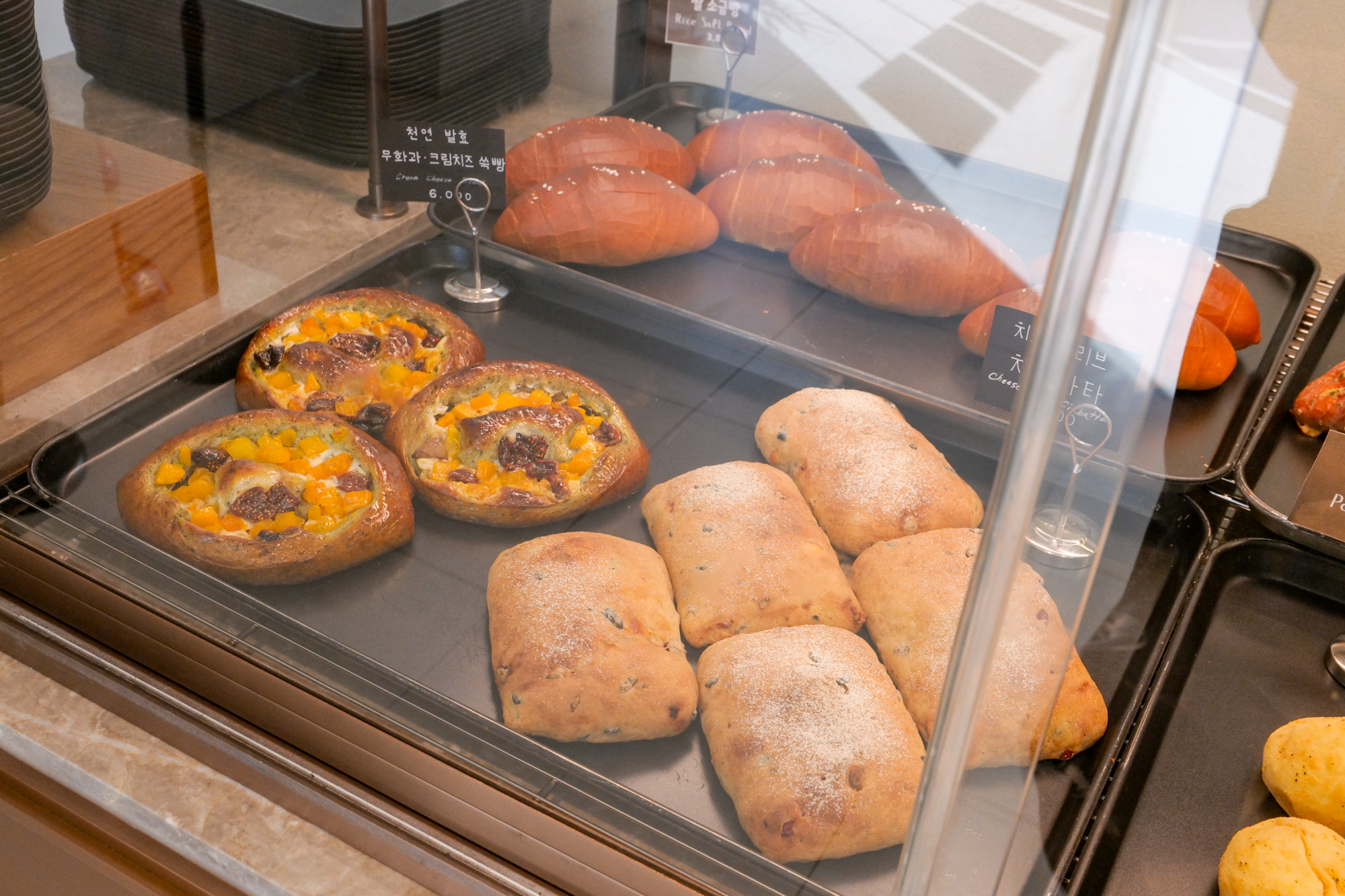 제주 애월 카페에는 그래인스쿠키 선물세트뿐만 아니라 당일 생산한 베이커리도 있었다. 소금빵, 마늘빵, 크루아상, 감자빵, 에그타르트, 패스츄리, 스콘, 치아바타, 무화과 크림치즈 쑥빵 등 하나같이 먹음직스러운 메뉴가 있어 브런치로 선택하기에도 좋았다.