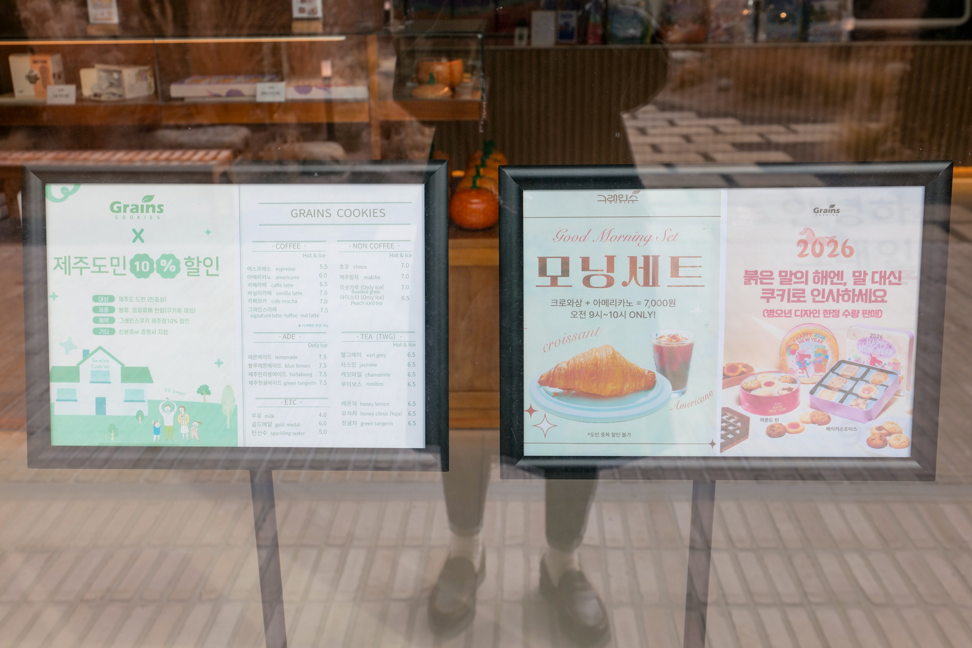 두쫀쿠가 있는 제주도 기념품 추천 그래인스쿠키로 들어가는 길에는 이곳에서 주문할 수 있는 커피, 음료, 베이커리에 관한 내용이 담긴 메뉴표가 있으며 매일 오전 9시부터 오후 10시까지는 7,000원에 크로와상과 아메리카노를 주문해 먹을 수 있다.