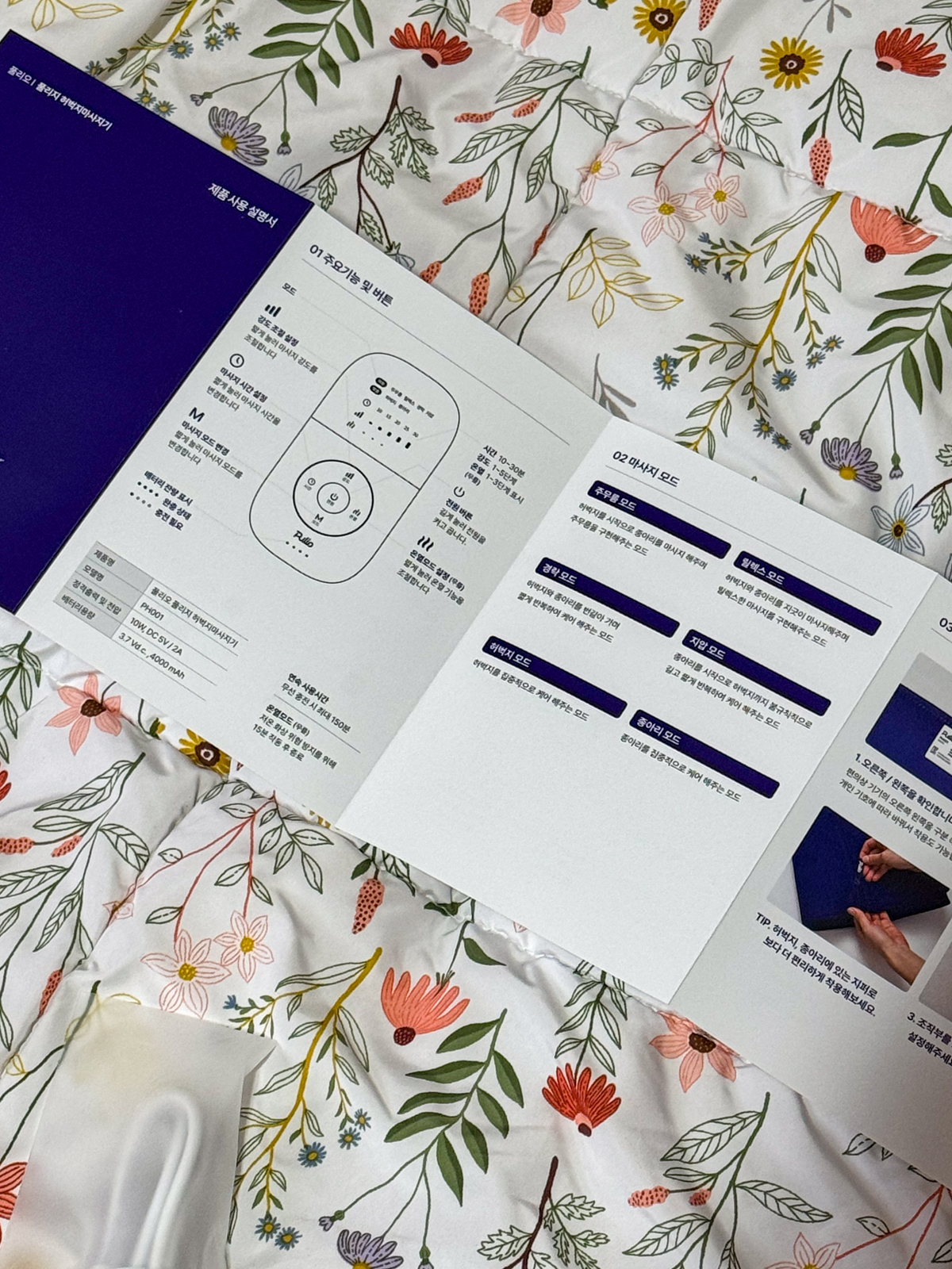 설날 선물 추천 풀리오 풀리지 허벅지 종아리 마사지기에 본체와 함께 동본된 설명서에는 제품 스펙 및 주요 기능과 버튼, 마사지 모드, 사용 방법, 배터리 충전 방법에 관해 상세히 안내되어 있어 처음 사용하는 분들이라면 꼼꼼하게 읽어보는 게 좋다.