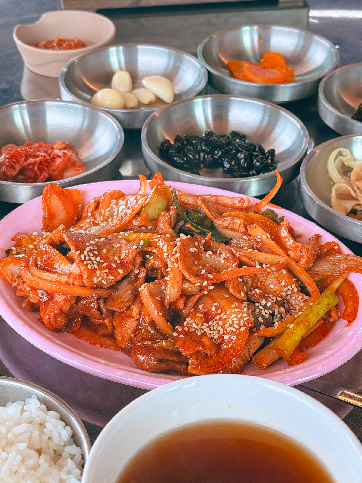 제주 놀이방 있는 식당 애월자연농원에 방문한 날에는 내돈내산 점심 메뉴로 1인 11,000원짜리 제육볶음 정식을 주문했다. 메뉴를 주문하면 기본 밑반찬이 먼저 나오는데 모두 이곳에서 직접 만들었으며 이어 나왔던 제육볶음과 배추 된장국도 먹음직스러웠다.