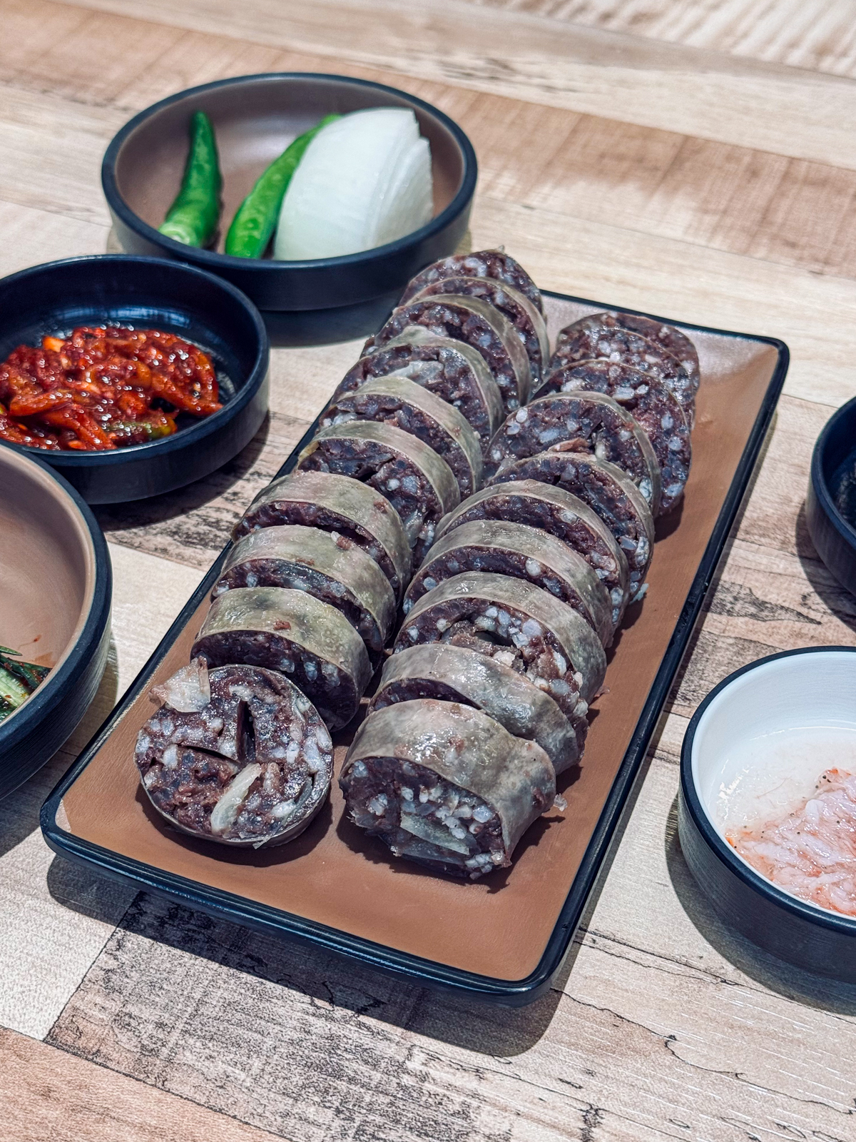 감초식당 신제주점에 방문했던 날에는 혼밥 저녁식사로 마농 돼지해장국과 함께 맛보기 순대를 주문했다. 메뉴를 주문하고 조금 기다리면 이곳에서 직접 만든 밑반찬으로 파무침, 깍두기, 오징어젓갈 등이 먼저 나온다.
