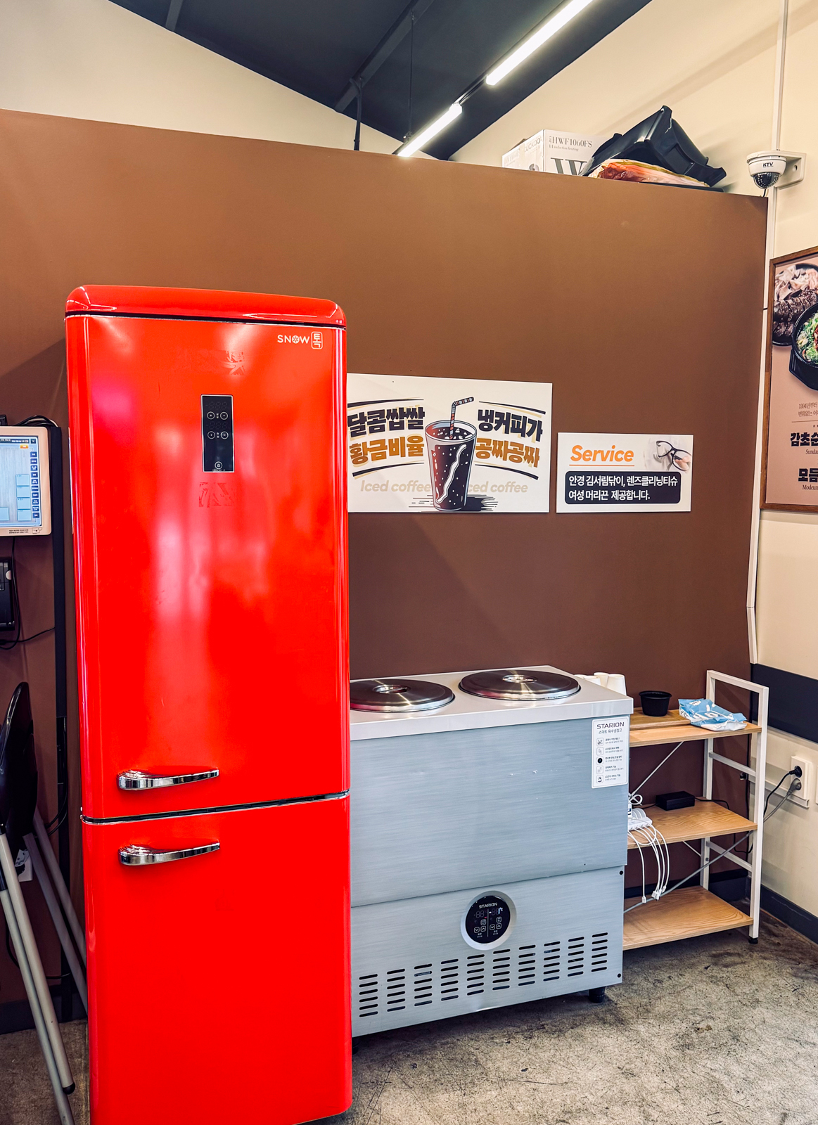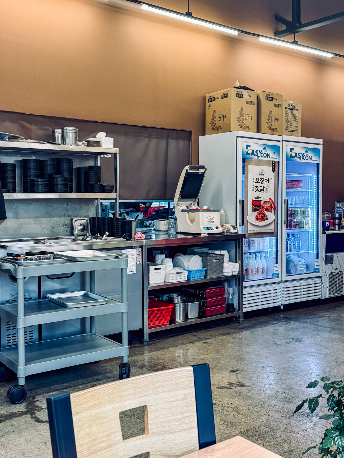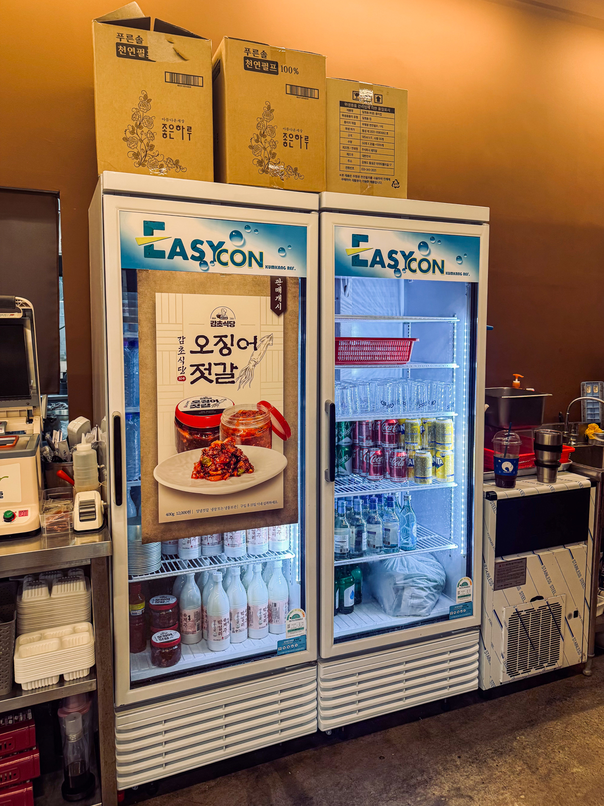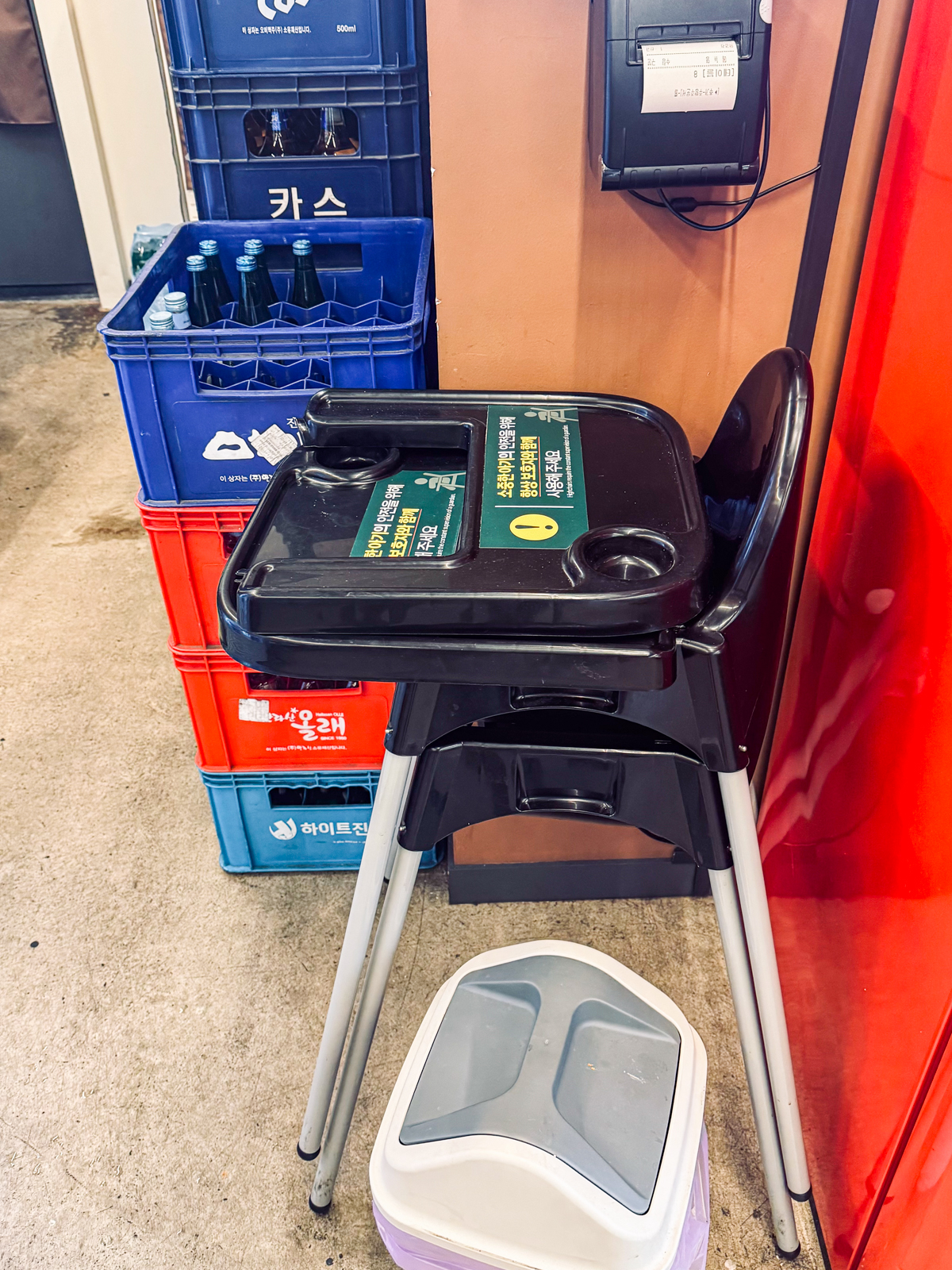 감초식당 신제주점에는 내부에 소주, 맥주, 막걸리, 음료수가 있는 냉장고와 함께 유아용 식탁의자도 마련되어 있어 아이랑 함께 가기에도 좋은 식당이다.