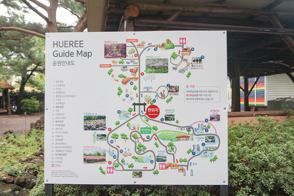 휴애리 자연생활공원 수국축제가 진행되는 현장으로 들어가는 곳에는 공원안내도가 있다. 현위치에서 길을 따라 관람하다가 매시각 정시에 진행되는 '흑돼지야 놀자' 공연을 보고난 후 수국정원이 있는 곳으로 쭉 따라 내려오면 모든 관람이 끝난다.