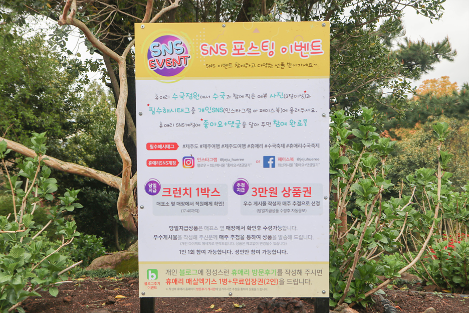 또한 제주 휴애리에서는 수국축제가 진행되는 동안 관람 도중 찍은 사진을 인스타그램, 페이스북에 올리면 제주 한라봉 크런치를 증정하고 있다.