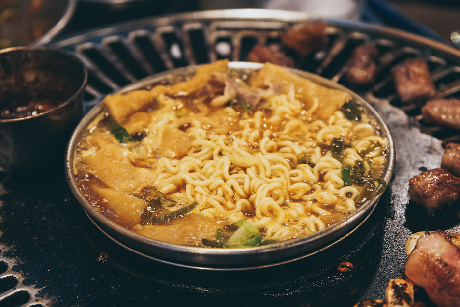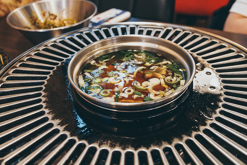 제주도 흑돼지 맛집 하몽돼지에서는 불판 한가운데에 오뎅탕을 끓여준다. 오뎅탕 육수가 모자라는 경우에는 직원에게 요청하면 되는데 어느정도 먹고난 후 오뎅탕에다가 라면을 끓여먹을 수 있다.
