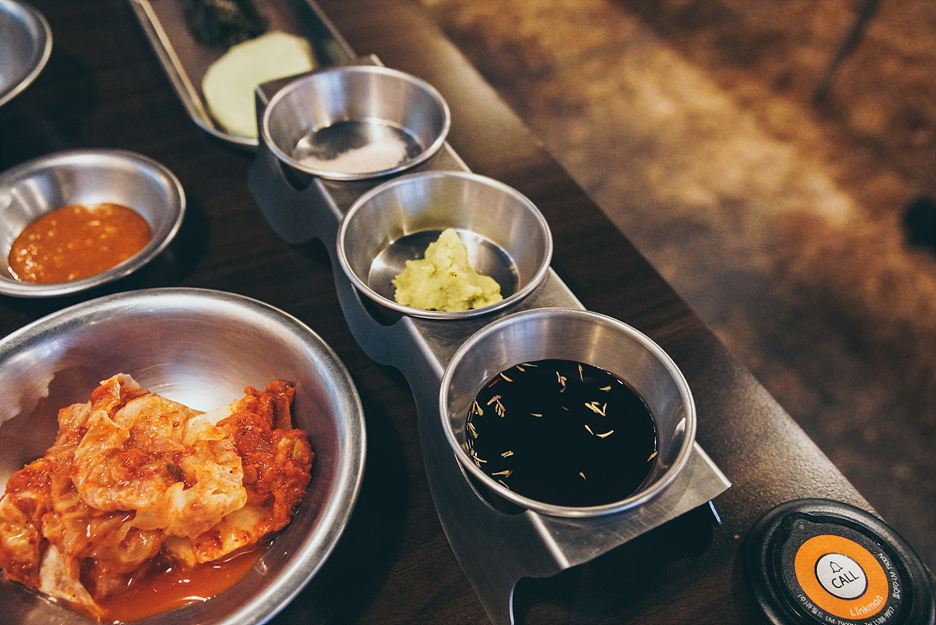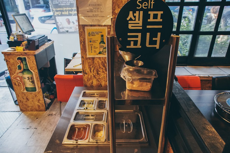 제주도 흑돼지 맛집 하몽돼지에서는 이베리코 흑돼지를 먹다가 반찬이 모자라는 경우 셀프코너를 통해 직접 가져다 먹을 수 있다. 참고로 하몽돼지에서는 고기를 스테이크 소스, 와사비, 소금에 찍어 먹는 걸을 권장하기에 된장이 나오지 않는데 셀프코너에 가서 보니 된장이 있었다.