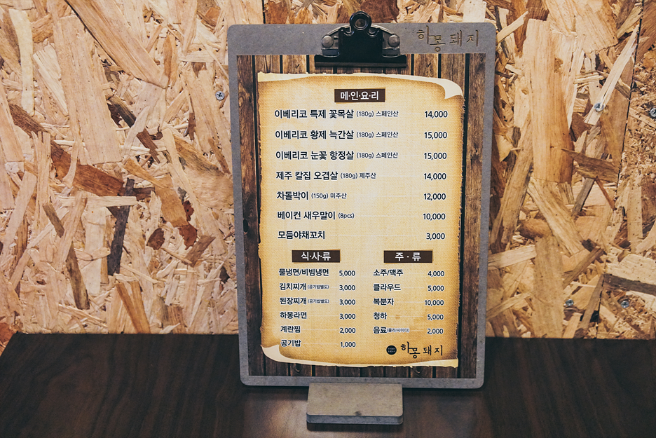 제주 하몽돼지에서 주문할 수 있는 스페인 이베리코 흑돼지로는 꽃목살, 늑간살, 항정살이 있으며 제주산 오겹살과 미주산 차돌박이도 맛볼 수 있다.