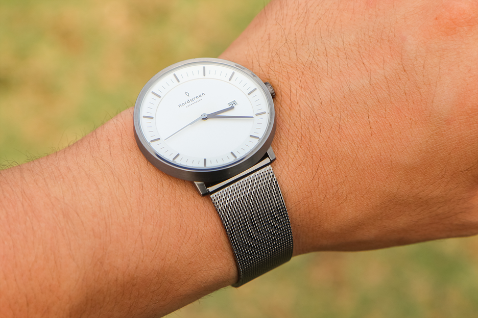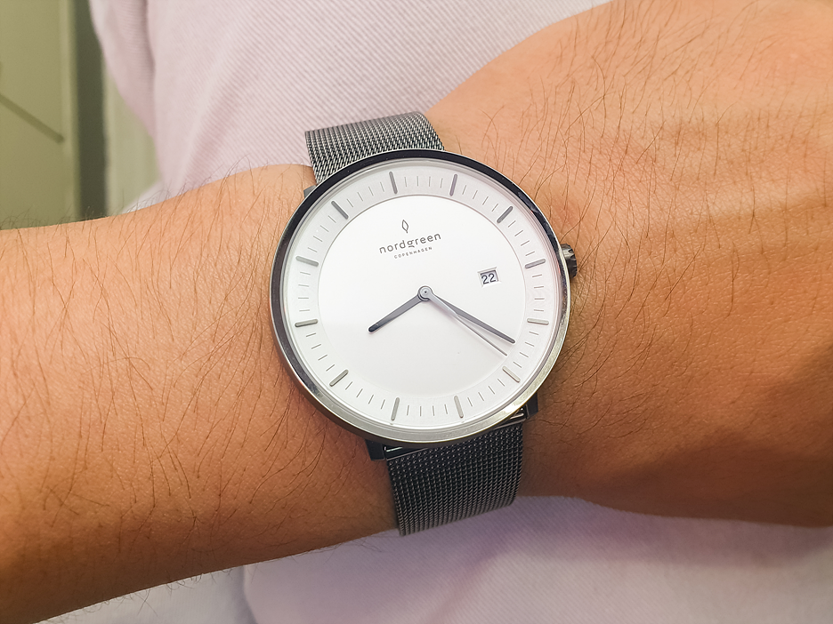 이전에 착용했던 타사의 메탈 시계인 경우 시계 자체가 두꺼워 수트 차림이 아니면 소화하기 어려웠던 반면, 노드그린 시계는 반팔 상의와도 잘 어울리며 메쉬라 그런지 땀이 차지도 않았다.