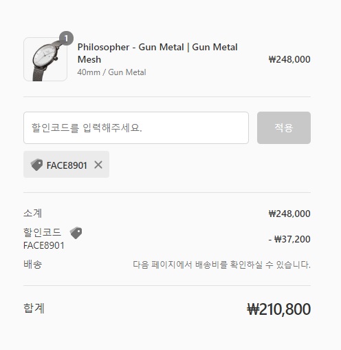 (내가 선택한 모델은 필로소퍼 건 메탈 메쉬 시계로 정가 248,000원이나 할인코드를 입력하니 210,800원에 주문할 수 있었다)