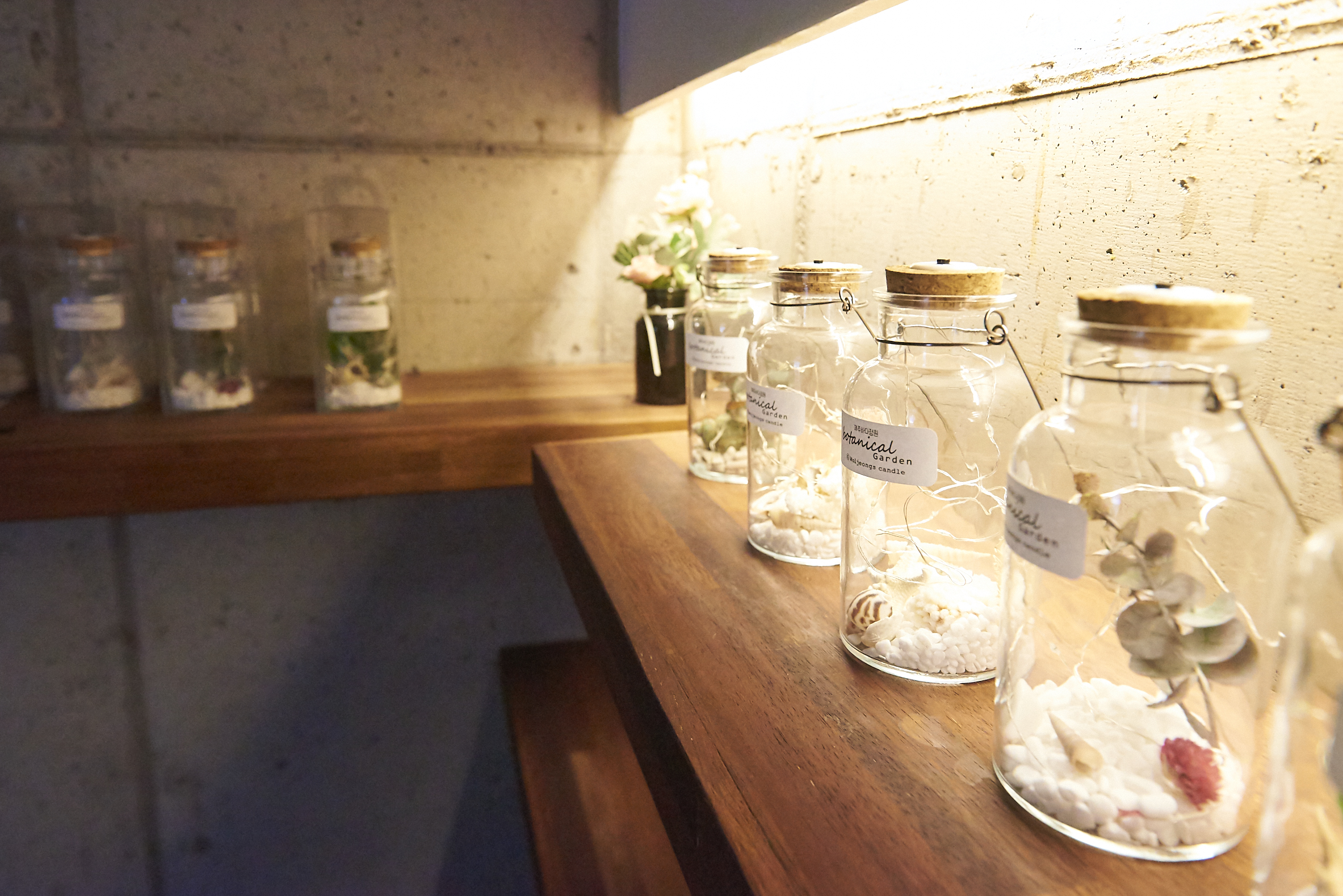 매장 내부 한쪽 벽면에는 캔들이 하나씩 줄지어 있었는데 전시회로 관람을 간듯한 기분마저 들기도 했어요. 뒤쪽으로 은은하게 조명도 비춰주고 있어서 구경하는 동안 마음이 편안해졌어요.