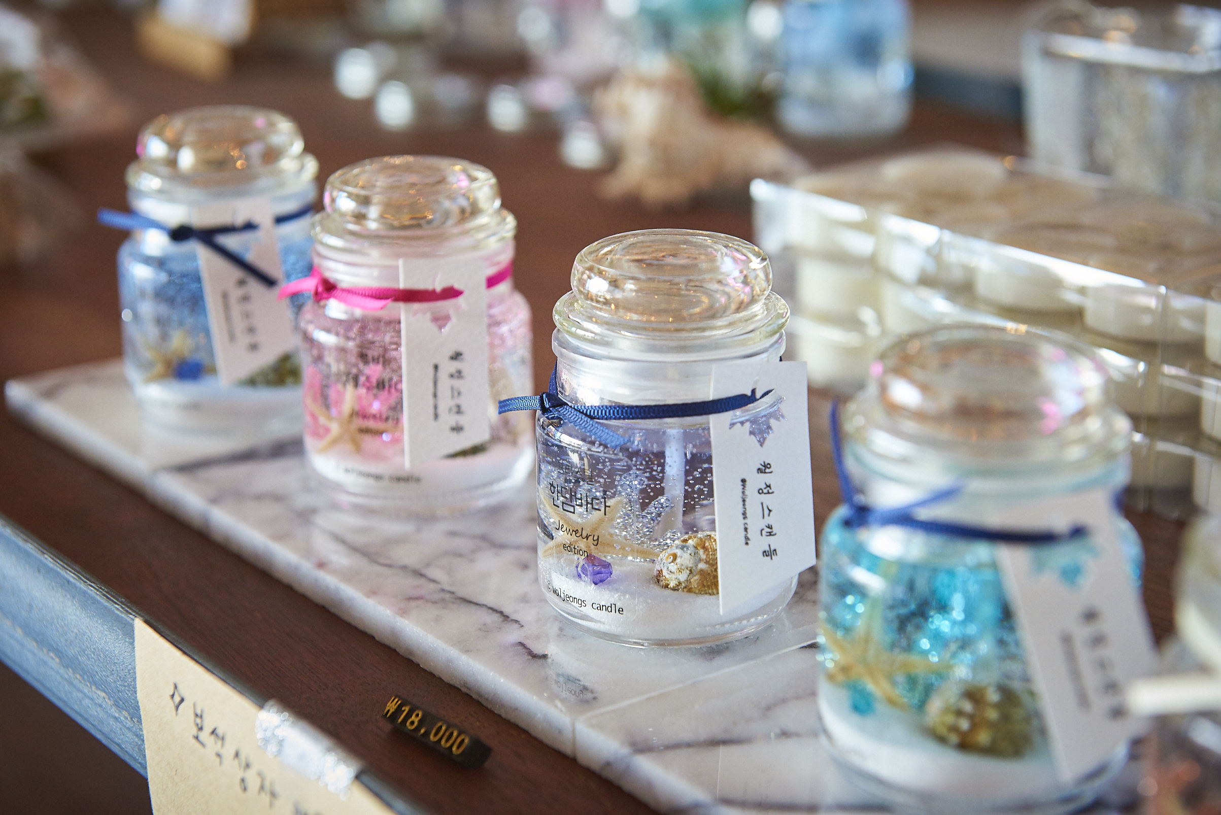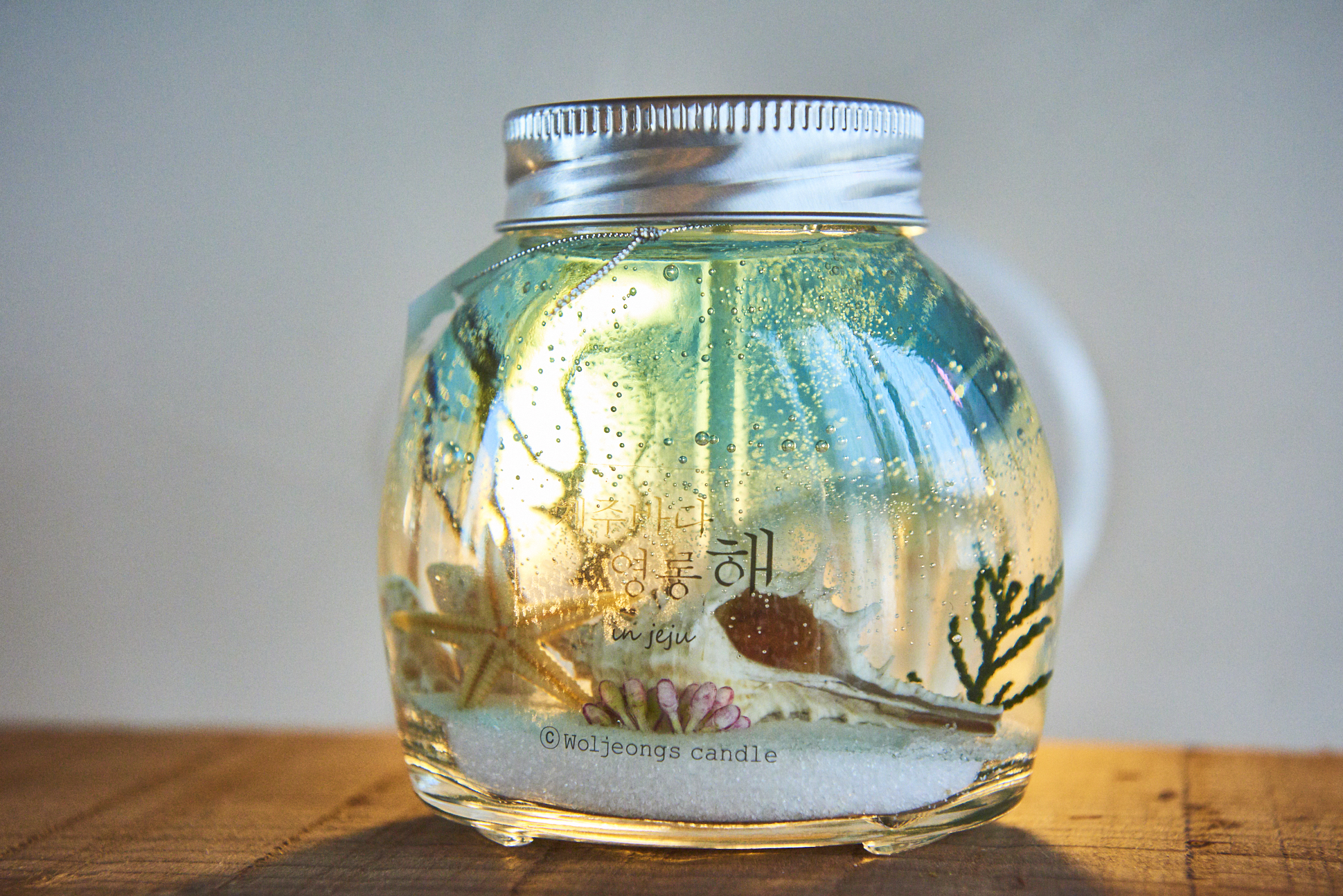 제주바다를 담은 듯한 캔들인 경우 속에 모래를 표현하는 재료, 불가사리, 소라 등 다채롭게 들어가 있었는데 보면 볼수록 실제 바다를 작게 압축해놓은 거 같았어요. 매일 밤마다 침대 옆에 두고 잠들면 기분 좋은 꿈만 꿀 것 같더라고요.