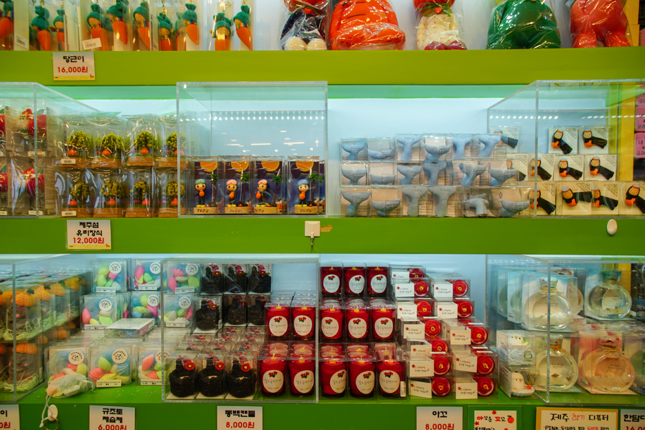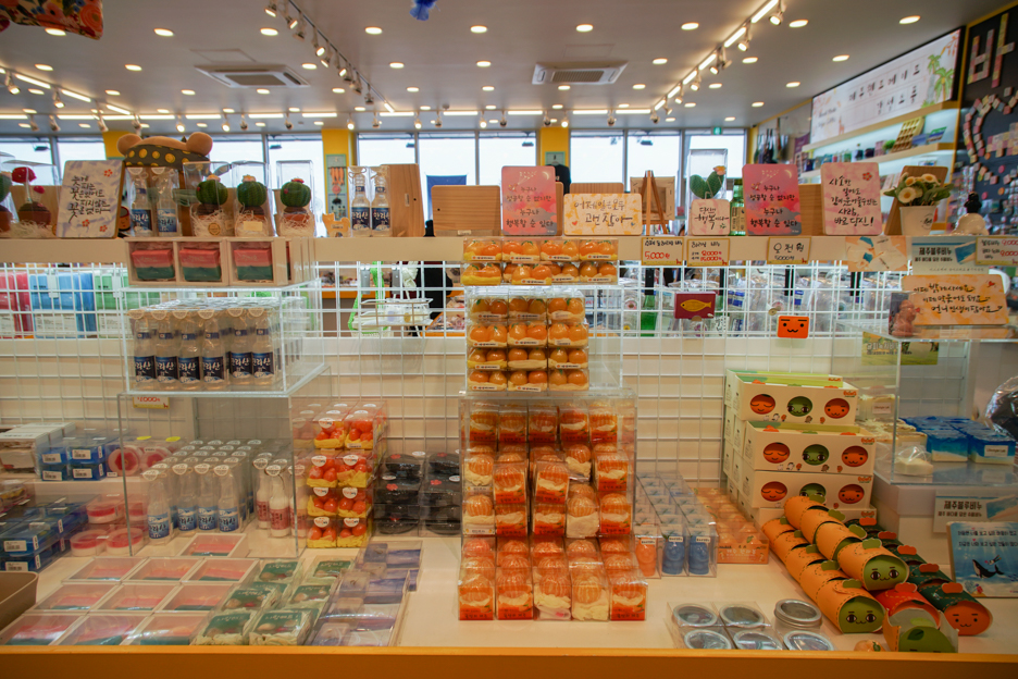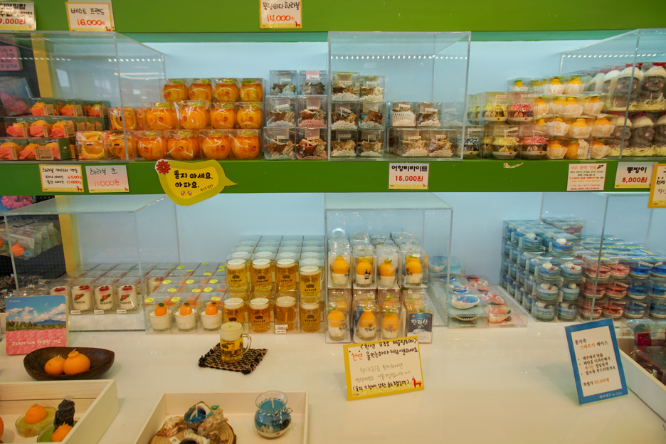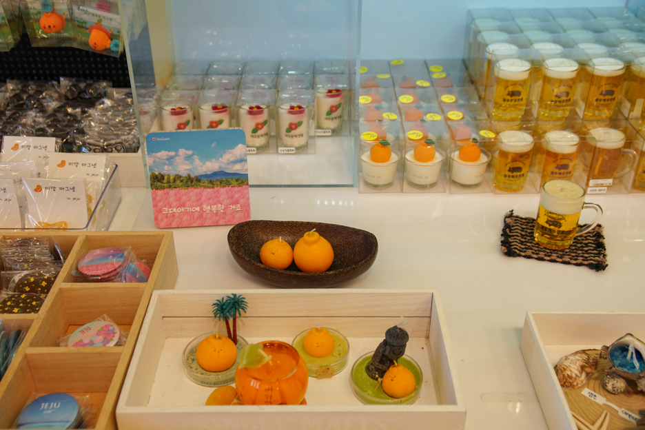 제주공항 면세점 근처 바이제주에서는 실제 한라봉과 제주감귤, 한라산소주, 제주도막걸리를 똑같이 표현한 수제비누도 있어 여행 기념품으로 선택할 만한 소품이 곳곳에 가득했다.