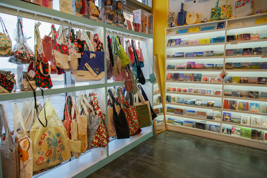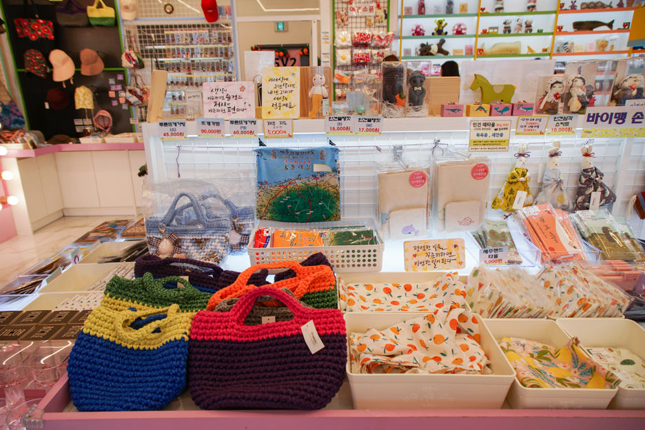 제주 배지가 놓여 있는 가운데 진열장을 살펴보면 한라봉을 표현한 핸드백뿐만 아니라 여러 패턴과 무늬가 담겨진 손수건이 있으며 소품 작가가 손수 만든 아기자기한 인형과 열쇠고리, 키링이 있어 일상 소품이나 필요에 따라 구매할 수 있는 상품이 넘쳐나 제주 소품샵 중에서는 가장 많은 종류의 기념품을 만나볼 수 있다는 걸 실감케 했다.