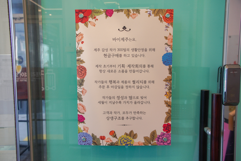 제주공항 면세점 근처 바이제주에는 무려 300팀에 달하는 제주 소품 작가가 만든 핸드메이드 상품을 진열하고 있는데, 바이제주에서는 모든 소품을 현금으로 구매해 지역 경제에 이바지하고 있다.
