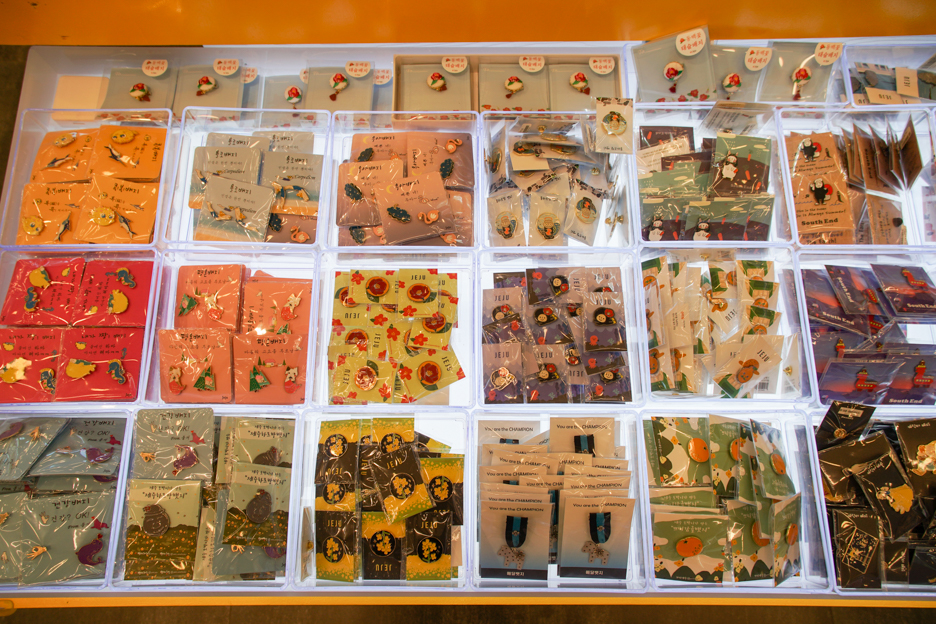 제주공항 면세점 근처에는 마그넷 종류만큼 다양하게 구성된 배지도 있었다. 패션 아이템으로도 쓰기 좋은 꽃과 제주도 감성을 담아낸 아기자기한 배지로 구성되어 있으며 낱개로 구매가 가능하기에 가격적인 부담없이 기념품으로 선택할 수 있었다.