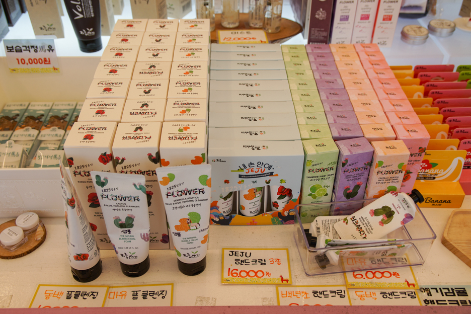 제주공항 면세점 근처 바이제주 2층에는 제주도 화산송이, 선인장, 백년초, 한라봉 등을 넣어 만든 천연화장품이 있어 본인이 직접 사용하거나 부모님에게 드릴 선물로 선택하기 좋았다.