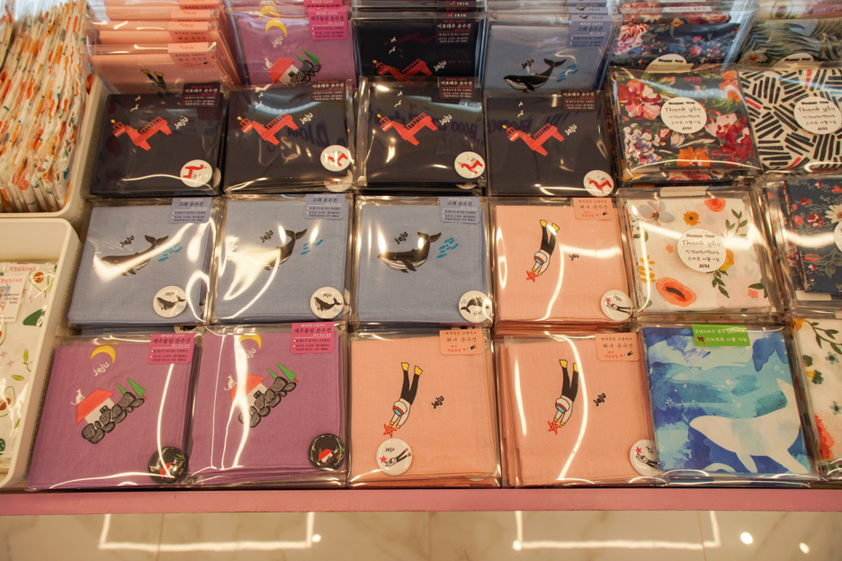 2층 매장 가운데에는 제주해녀, 돌고래, 이호테우해변, 돌하르방을 담아낸 손수건이 있었는데 직접 만져보면 천 재질이 무척 고급스럽다는 것을 알 수 있다.