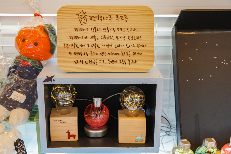 바이제주에는 제주도 편백나무로 만들어진 무드등 디퓨저도 판매하고 있다. 피톤치드를 내뿜기에 호흡기 질환이나 피부질환 개선에 도움을 주는 편백나무로 제작되어 있었고, 인테리어 소품으로 활용해도 될 만큼 디자인 또한 뛰어나 여행 기념품으로 선택하기에 알맞았다.