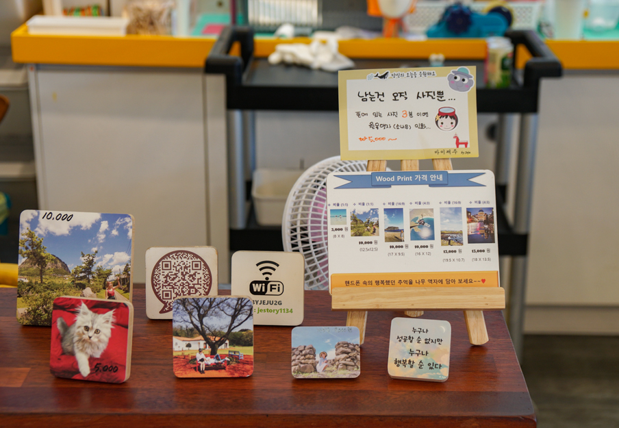 바이제주에서는 제주여행 중 찍은 스마트폰 사진을 가져가면 소나무로 만들어진 원목액자에 인화할 수 있는 우드프린트를 이용해볼 수 있다.