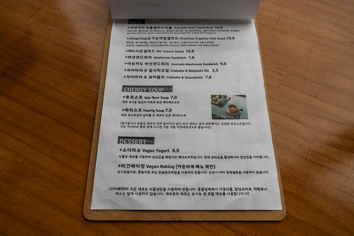 세트메뉴가 아니더라도 단품을 통해 아보카도곡물샐러드, 유기농케일샐러드, 901시즌샐러드, 버섯샌드위치, 아보카도 버섯샌드위치, 치아바타 발사믹오일, 치아바타 과카몰리, 제주유기농당근과 비트로 만든 루트스프, 제주표고버섯과 감자로 만든 하티스프, 소이미슈 채식요거트, 비건베이킹빵 등 식물성 재료만을 사용한 음식을 주문해서 먹을 수 있다.