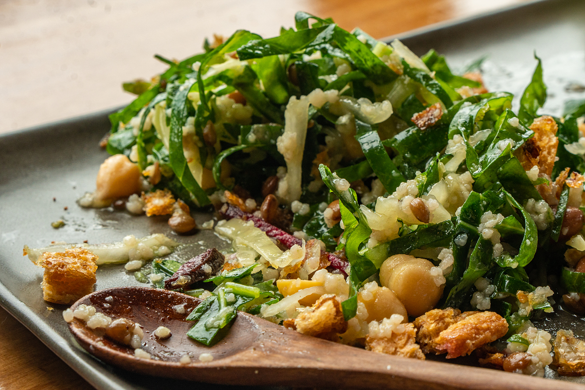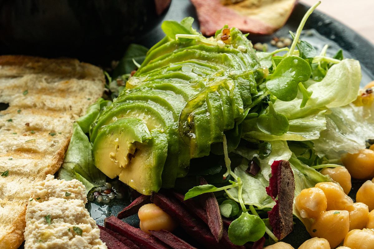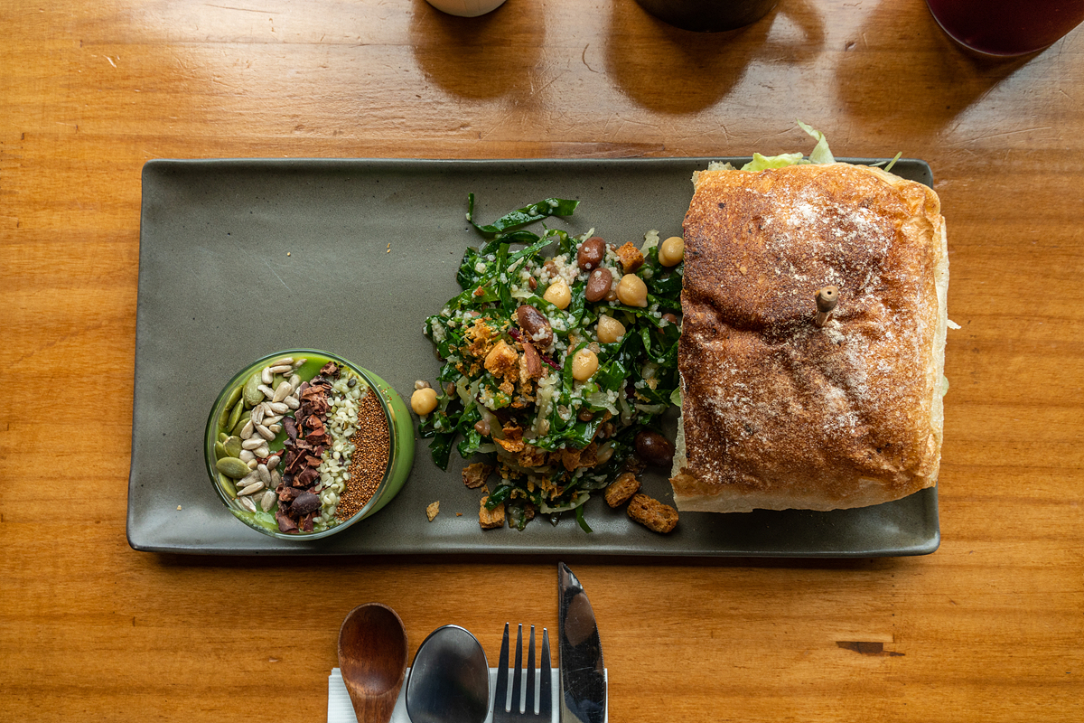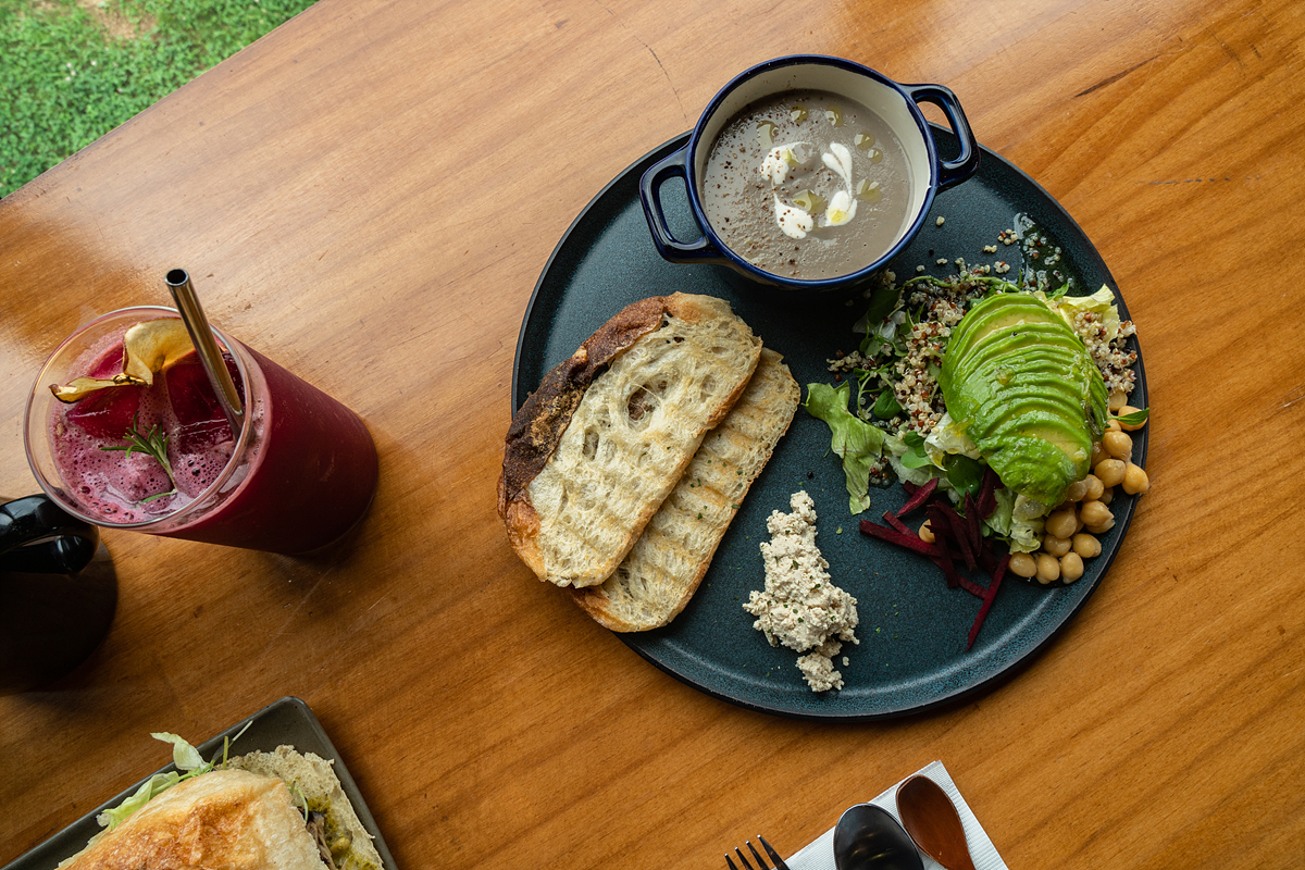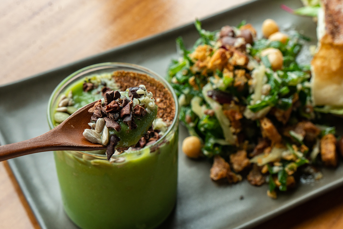 이곳은 자연 효소가 들어간 음식만을 추구하는 비건 전문 카페로 동물성(크림, 치즈, 우유), 설탕, 합성감미료이 들어가지 않으며, 샐러드 드레싱과 치즈를 모두 직접 만든다.