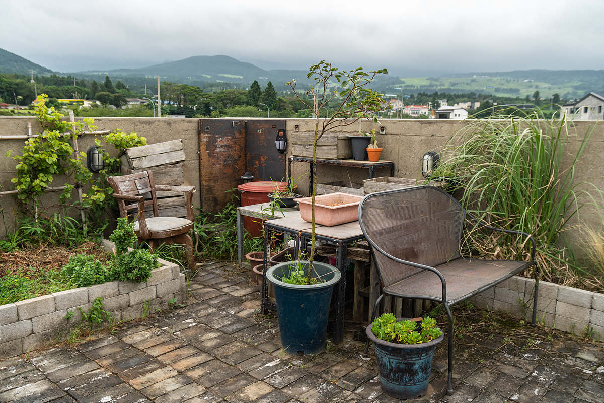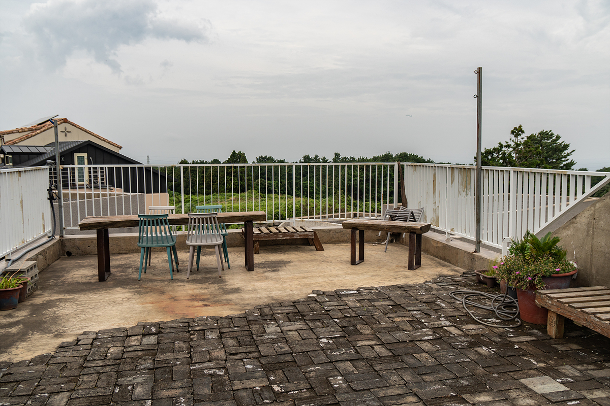제주 카페901 안쪽에 있는 문을 열고 계단을 따라 올라가면 한라산과 주변 풍경을 감상할 수 있는 루프탑이 있다. 사진을 찍을 수 있게 의자와 포토존이 설치되어 있었으나 이날은 비가 내려 아쉽게 예쁜 풍경을 담지 못했다.