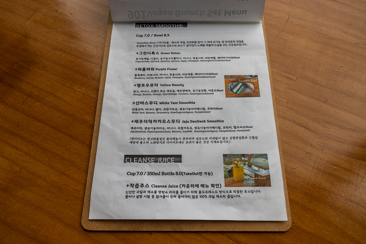 이곳에서 마실 수 있는 디톡스 스무디로는 그린, 퍼플파워, 옐로우뷰티, 산마, 제주더덕 카카오가 있으며 채소, 과일, 견과류를 갈아 그 위에 유기농 생견과류와 과일을 토핑해서 나온다.