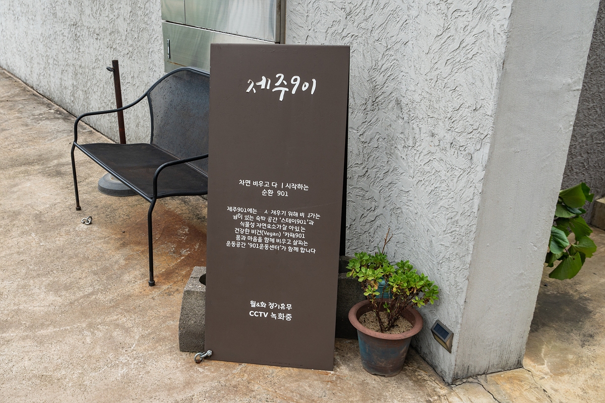 '몸과 마음을 함께 비우고 살피는 시간'이라는 주제로 '채우면 9, 비우고 0, 다시 시작하는 1'이라는 의미로 지어진 제주 카페901은 1층에 운동센터가 있는데 매주 수~일요일 오전 10시부터 스트레칭, 명상, 비건브런치를 함께 이용할 수 있다고 한다.