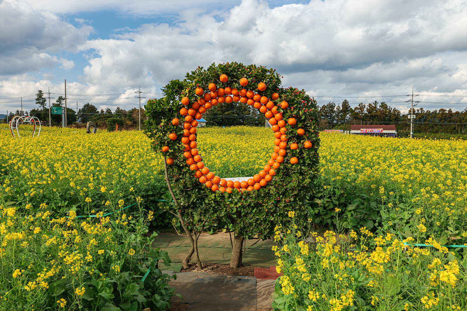 제주 유채꽃 피는시기 제주 짱구네 유채꽃밭 안쪽에는 제주감귤로 원형 모양을 낸 포토존이 보였다. 인스타그램에 올라온 사진을 보면 해당 포토존에서 4컷 사진을 찍고 올린 분들의 모습을 볼 수 있었는데 날씨와 상관없이 예쁜 사진을 담을 수 있다는 점이 매력적으로 다가왔다.