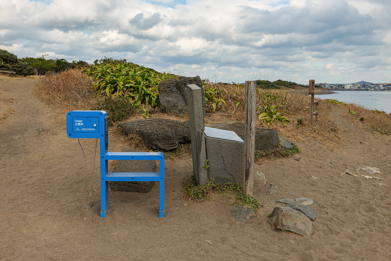 광치기해변은 제주 올레길 1코스 중 하나로 입구 앞에는 스탬프를 찍을 수 있도록 푯말이 표시되어 있다. 작년만 하더라도 이곳에서 승마 체험을 할 수 있었지만 최근에 갔을 때는 운영을 하고 있지 않았고 앞에서 감귤을 판매하는 아주머니의 모습만 보였다.