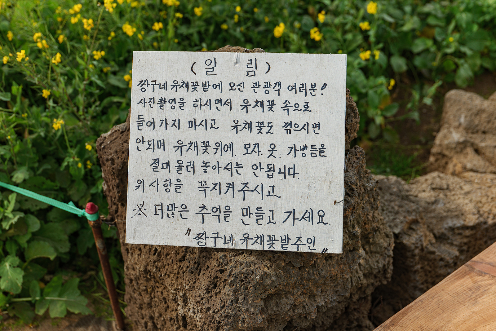 제주 유채꽃 피는시기 짱구네 유채꽃밭은 꽃을 보호하기 위한 안내문이 적혀 있었다. 유채꽃밭은 표시된 길을 따라 걸어야 하며 유채꽃밭 속으로 들어가거나 꽃을 뜯어서는 안 된다. 누군가 유채꽃 위에 옷, 가방을 올려둔 적이 있었는지 관련 내용이 안내되어 있기도 했다.