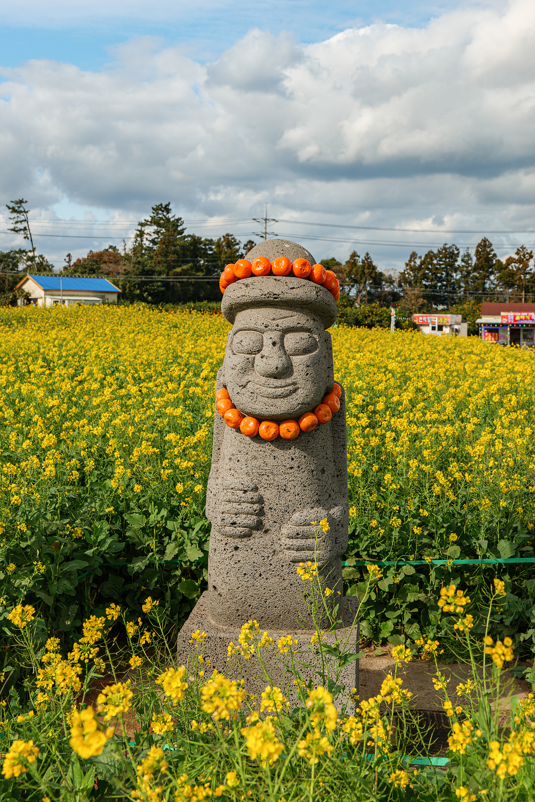 제주도 느낌을 물씬 안겨주는 돌하르방은 유채꽃밭 내에 총 두 개가 설치되어 있었다. 돌하르방에는 감귤로 포인트를 두었고 옆에서 함께 사진을 찍을 수 있게 공간도 마련되어 있다.