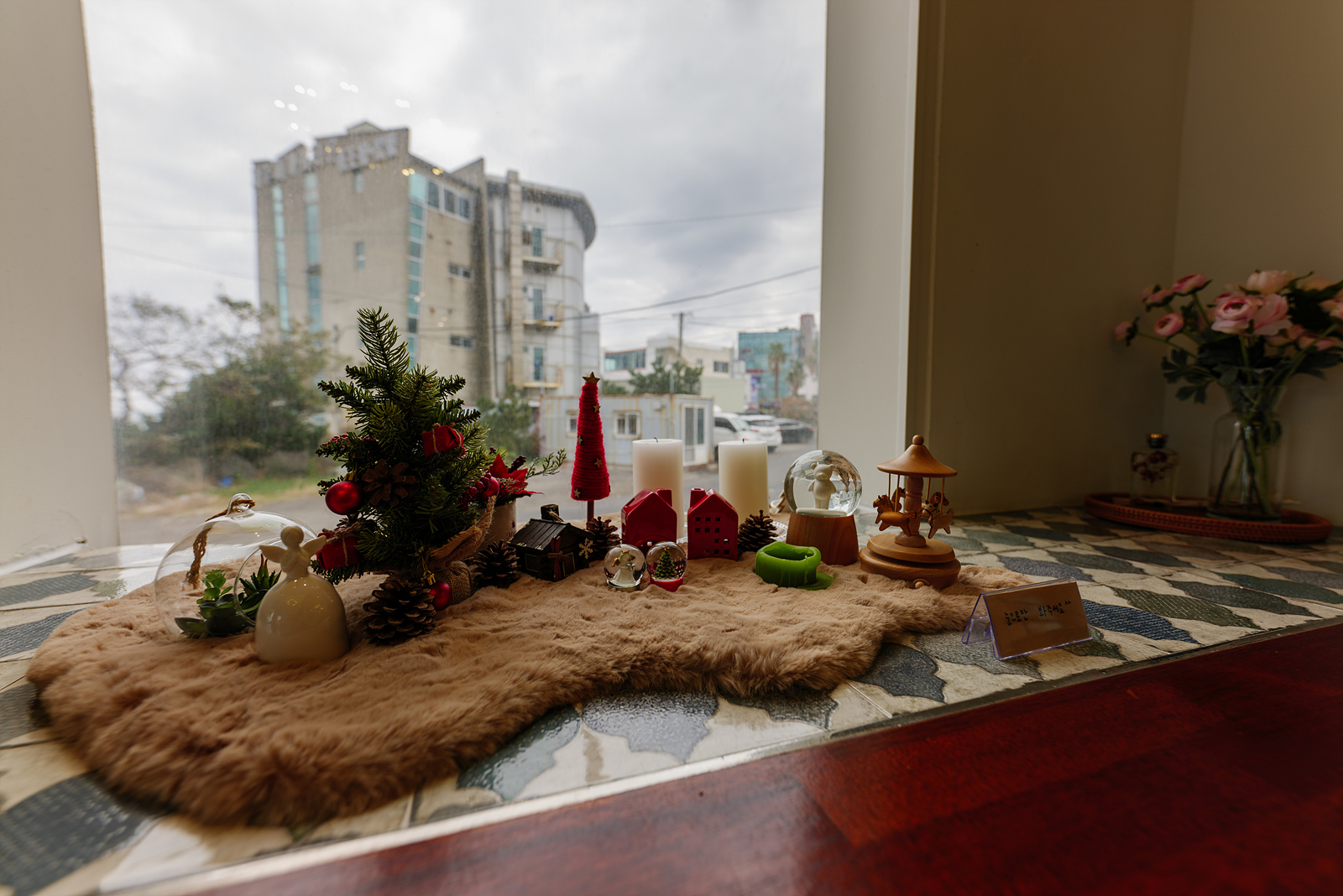 제주공항 근처 카페 시로코 1층 앞쪽에는 용담해안도로 바다가 보이는 창가 자리도 있었으며 다가오는 성탄절을 맞이해 크리스마스 소품을 두어 연말 분위기도 함께 느껴볼 수 있었다.
