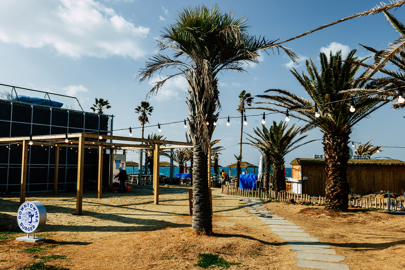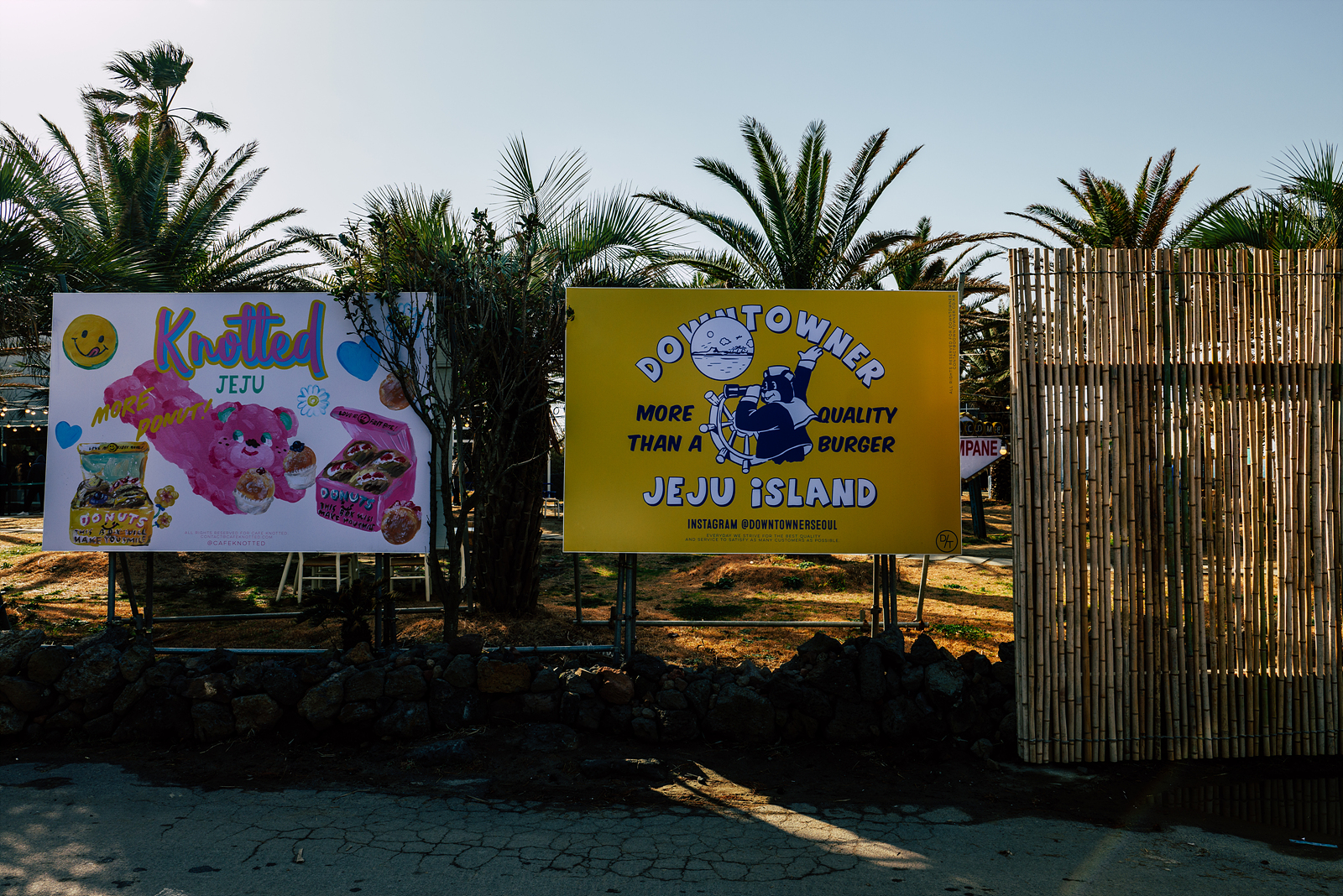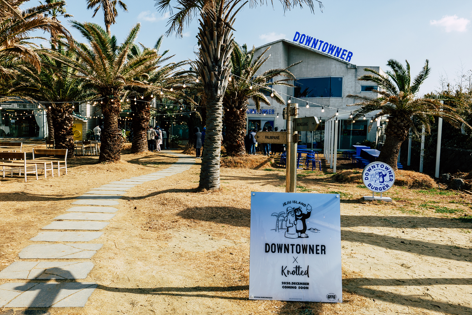 하이엔드 제주 주차장에서 바닷가 방향 쪽으로 조금 걸어가면 노티드 도넛과 다운타우너 버거가 적힌 표지판이 보이며 수많은 야자수를 따라 안쪽으로 들어가면 입구가 나온다.