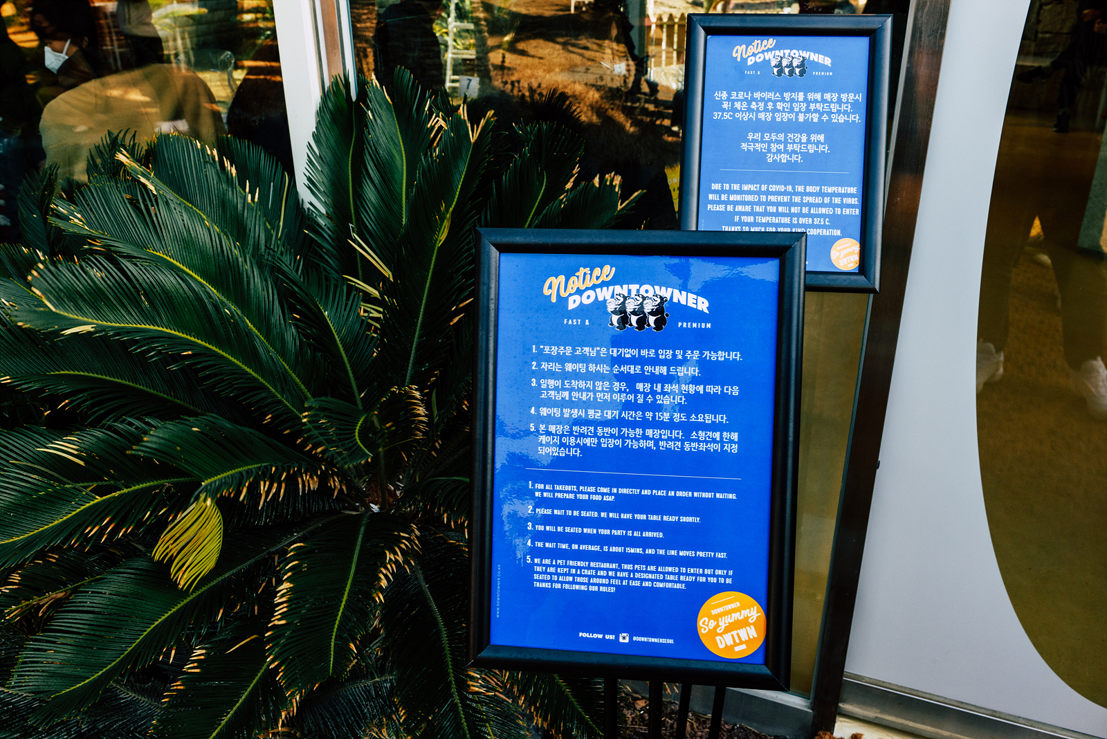 주문하고 음식이 나오는데 시간이 많이 소요되기에 넉넉잡아 40~50분 정도 걸린다고 보면 된다. 다운타우너 매장 안에는 케이지 이용 시 반려견과 함께 들어갈 수 있으며, 반려견 동반좌석이 따로 지정되어 있다고 한다.