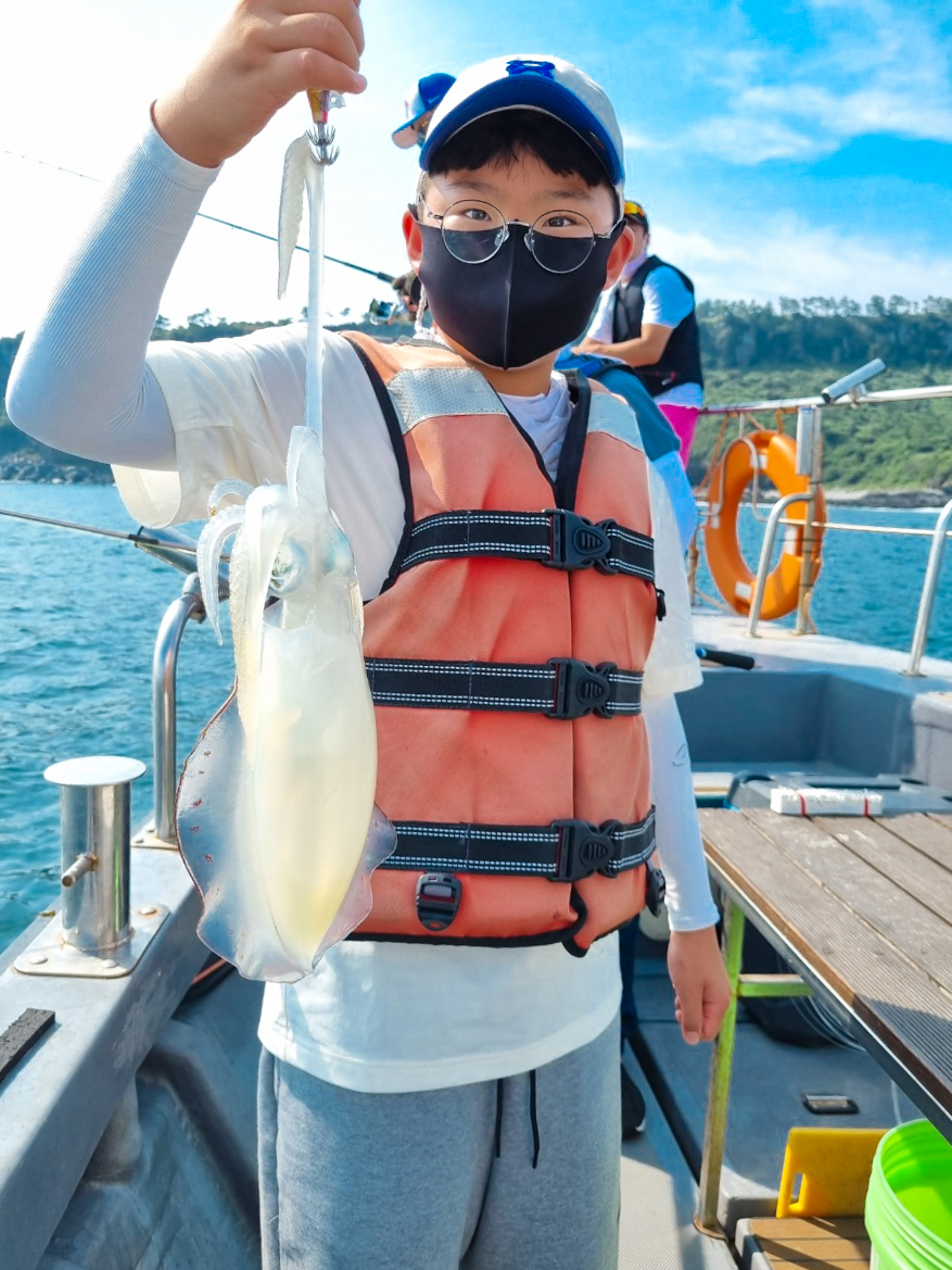 제주도 낚시 프라다 선상낚시에서는 성인뿐만 아니라 아이들도 무늬오징어 팁런에 도전할 수 있으며 구명조끼 등 안전장비가 제공되어 누구나 안전하게 체험해볼 수 있다.