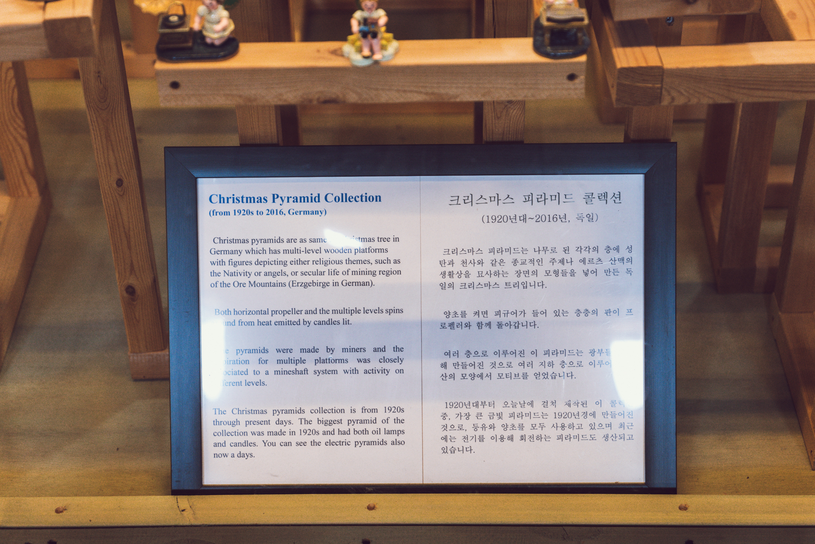 2층에는 독일 에르츠 산맥의 생활상을 묘사한 크리스마스 피라미드 콜렉션이 전시되어 있었다. 지금으로부터 100년 전인 1920년대에 제작됐으며 피라미드 사이사이 피규어가 들어 있는 등 전체적인 퀄리티가 매우 뛰어났다.