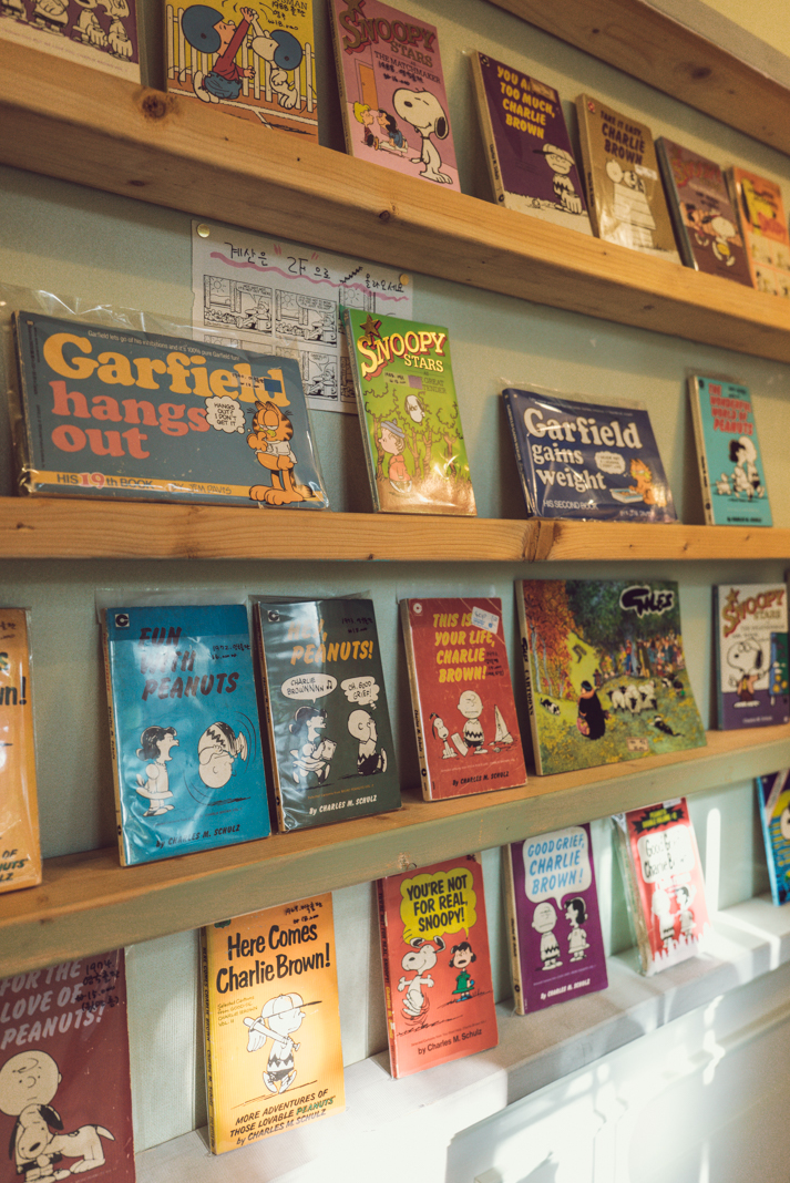 토마스하우스 내부 계단을 따라 1층에는 겨울철 감성이 느껴지는 여러 소품이 진열되어 있었다. 가방, 귀걸이, 목걸이, 머리띠 등은 필요에 따라 구매해서 가져갈 수 있었고 스누피 캐릭터가 담긴 책도 한쪽에 진열되어 있어 외국 감성 분위기가 전해졌다.