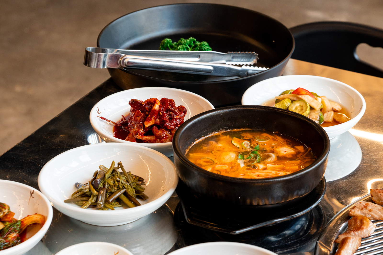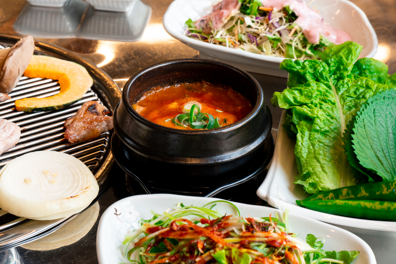 흑돼지와 함께 쌈을 싸서 먹기 좋은 샐러드와 파지 또한 양이 무척 많았다. 양이 모자라는 경우에는 테이블에 있는 진동벨을 눌러 직원에게 요청하면 가져다주어 서비스 또한 장점이라 할 수 있었다.