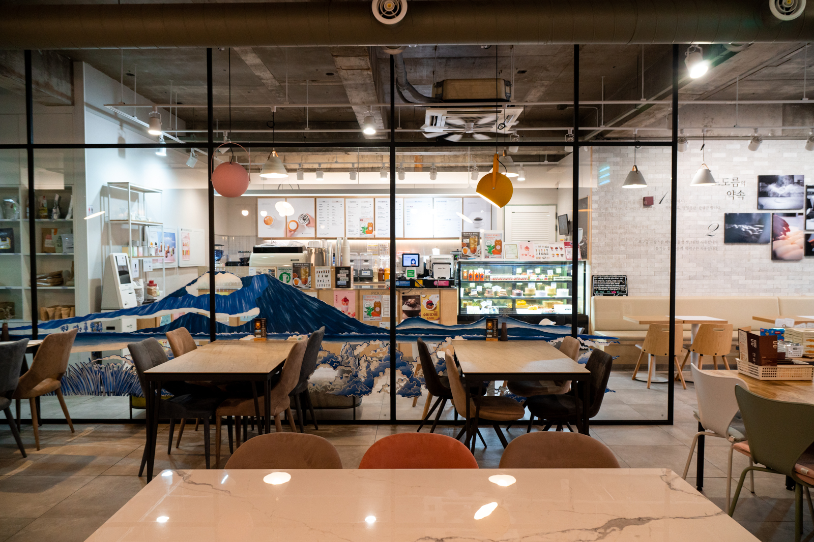 1층 카페 오른쪽에 있는 계단을 따라 2층으로 올라가면 야외 전망이 보이는 창가 자리와 함께 여러 명이 앉을 수 있는 원목 테이블이 갖춰져 있다.