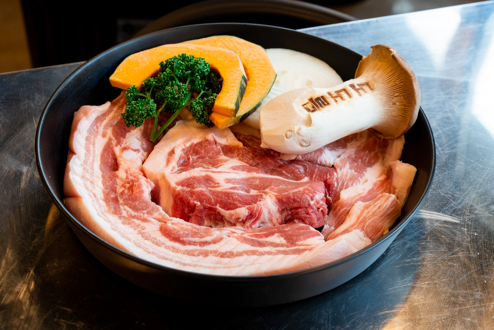 숯불의 화력에 금방 구워져서 먹기도 좋았는데 그동안 가봤던 제주시 연동 흑돼지 식당과 비교했을 때 확실히 품질이 뛰어났다. 흑돼지와 함께 양파, 버섯, 단호박도 구워주기에 기호에 따라 먹을 수 있다.
