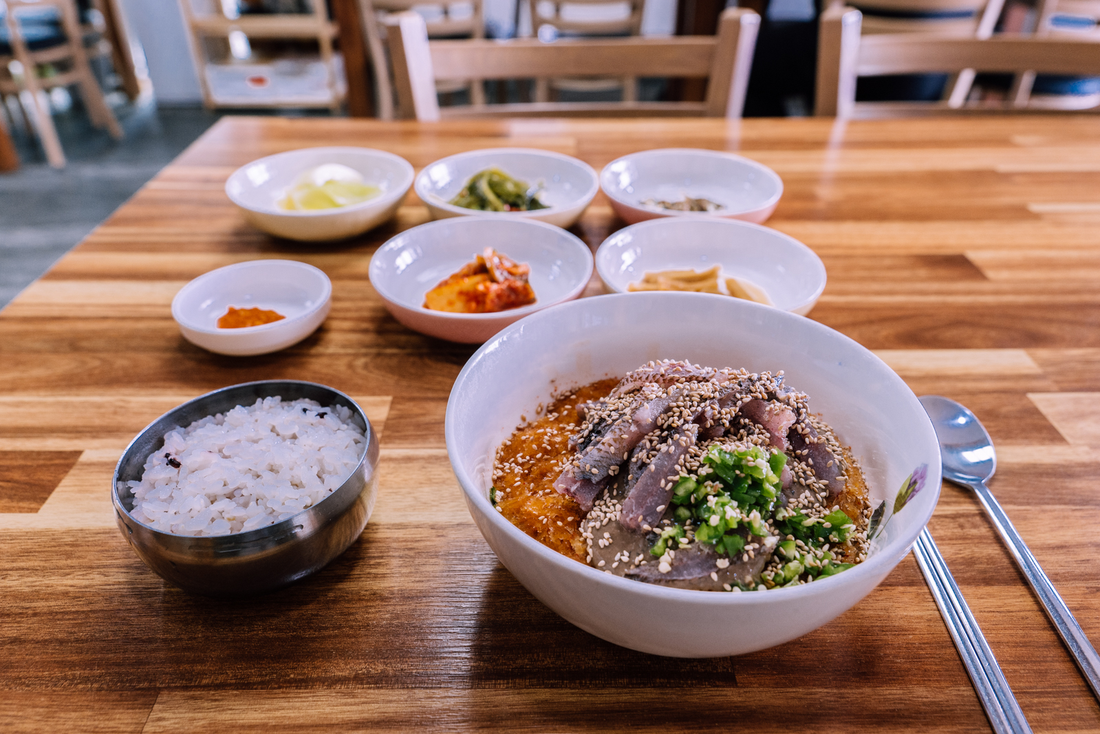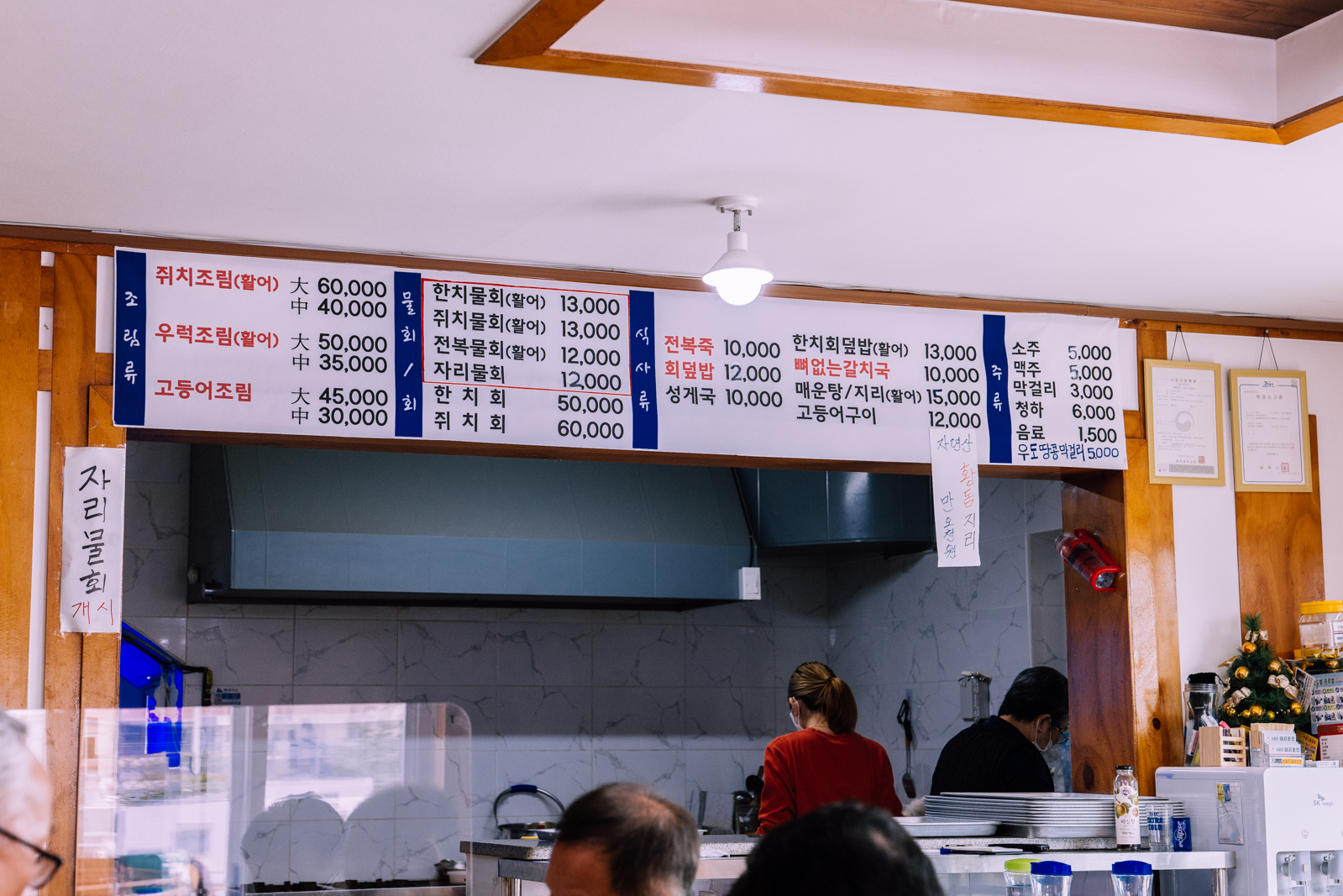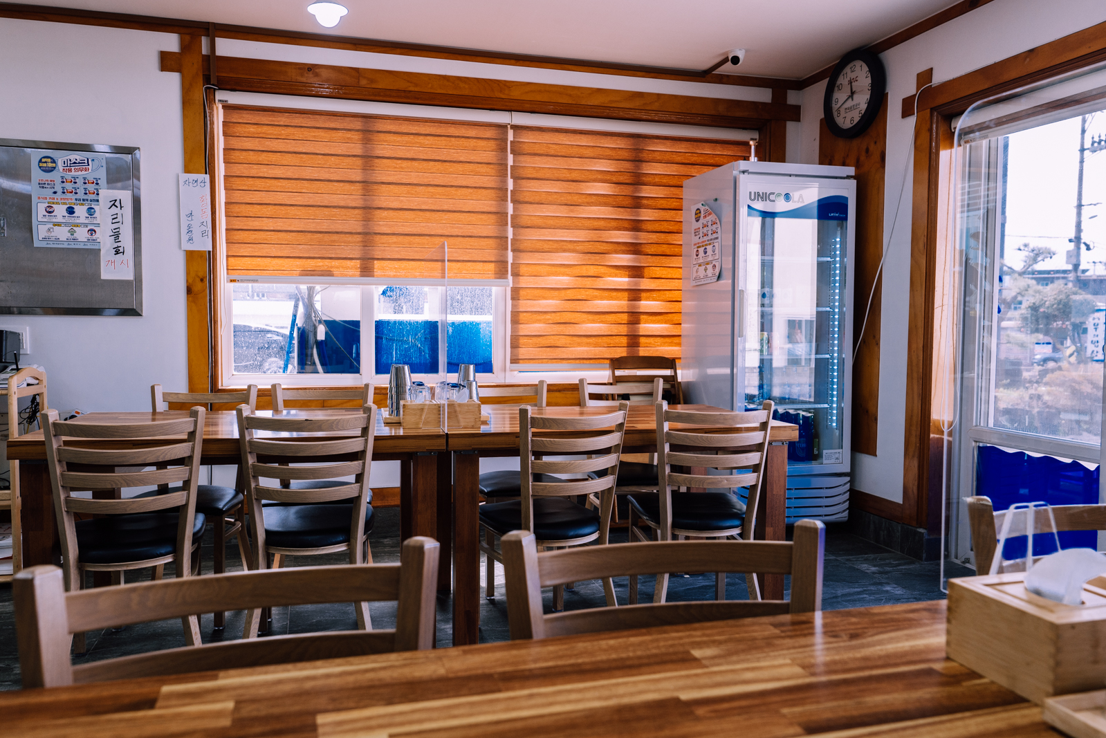 손님이 많은 점심시간대에 방문해 사진을 제대로 찍지 못했지만 내부 또한 전체적으로 따뜻한 느낌을 자아냈다. 사진에 보이는 곳 외에 안쪽에 룸도 따로 마련되어 있어 가족여행객이 가서 자리물회나 뼈없는 갈치국 등을 먹어도 좋을 것 같았다.