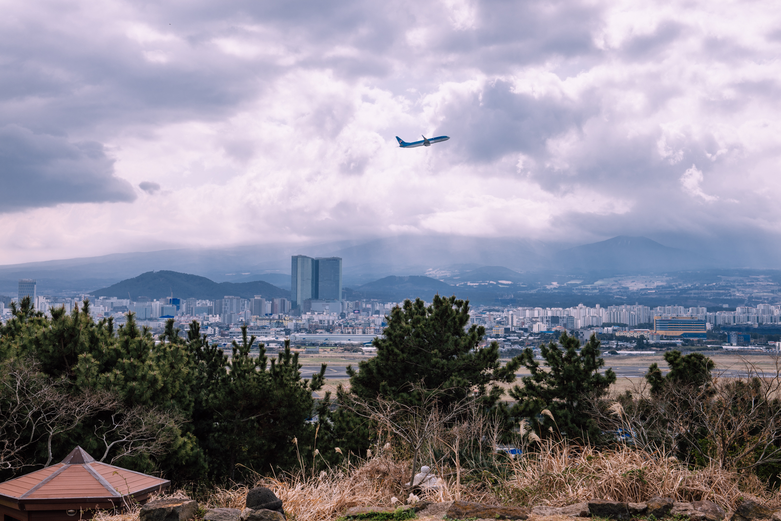 정상에서는 제주도에서 가장 높은 건물인 제주 드림타워도 한눈에 보인다. 바로 옆에는 제주공항 활주로가 있어 2~3분마다 비행기가 뜨는 모습도 쏠쏠한 재미를 준다.