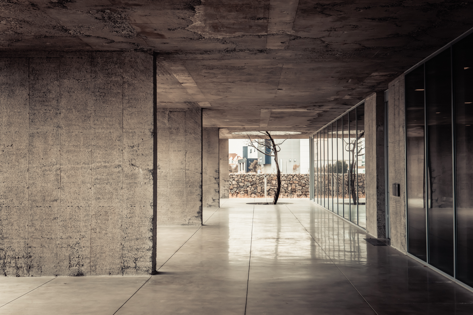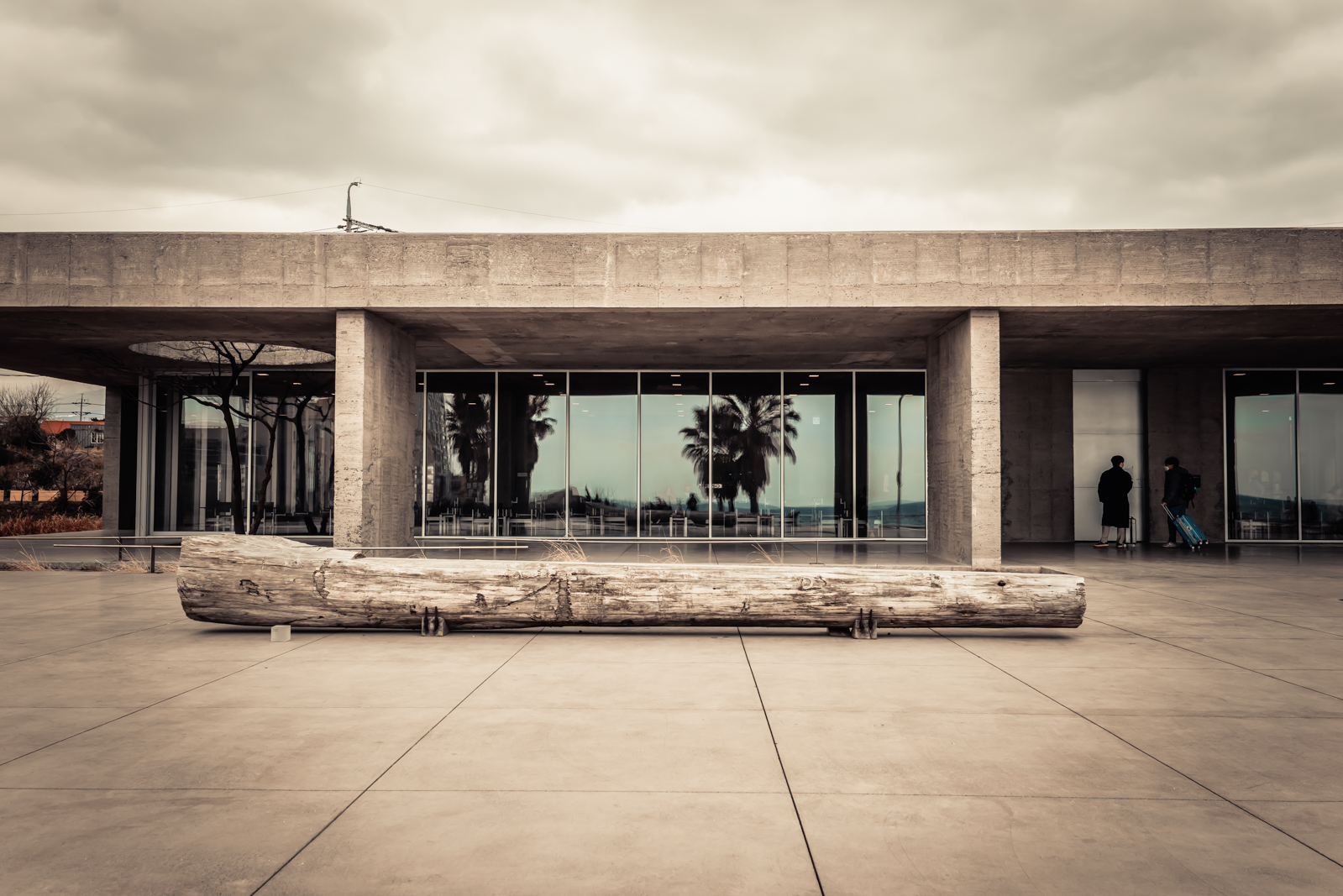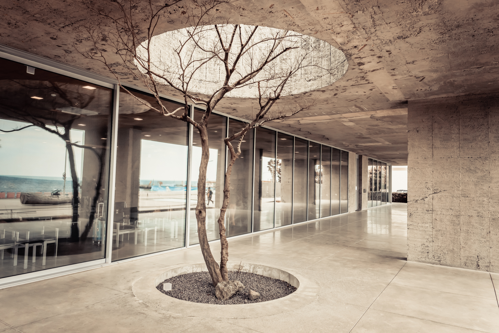 제주공항 근처 카페 진정성 종점 입구 앞에는 원형으로 뚫린 천장 아래 한 그루의 나무가 설치되어 있다. 바로 앞 창가로 야자수와 바다도 함께 보이기 때문에 구도를 잘 조절해서 찍는다면 색다른 느낌으로 사진을 담아낼 수 있다.