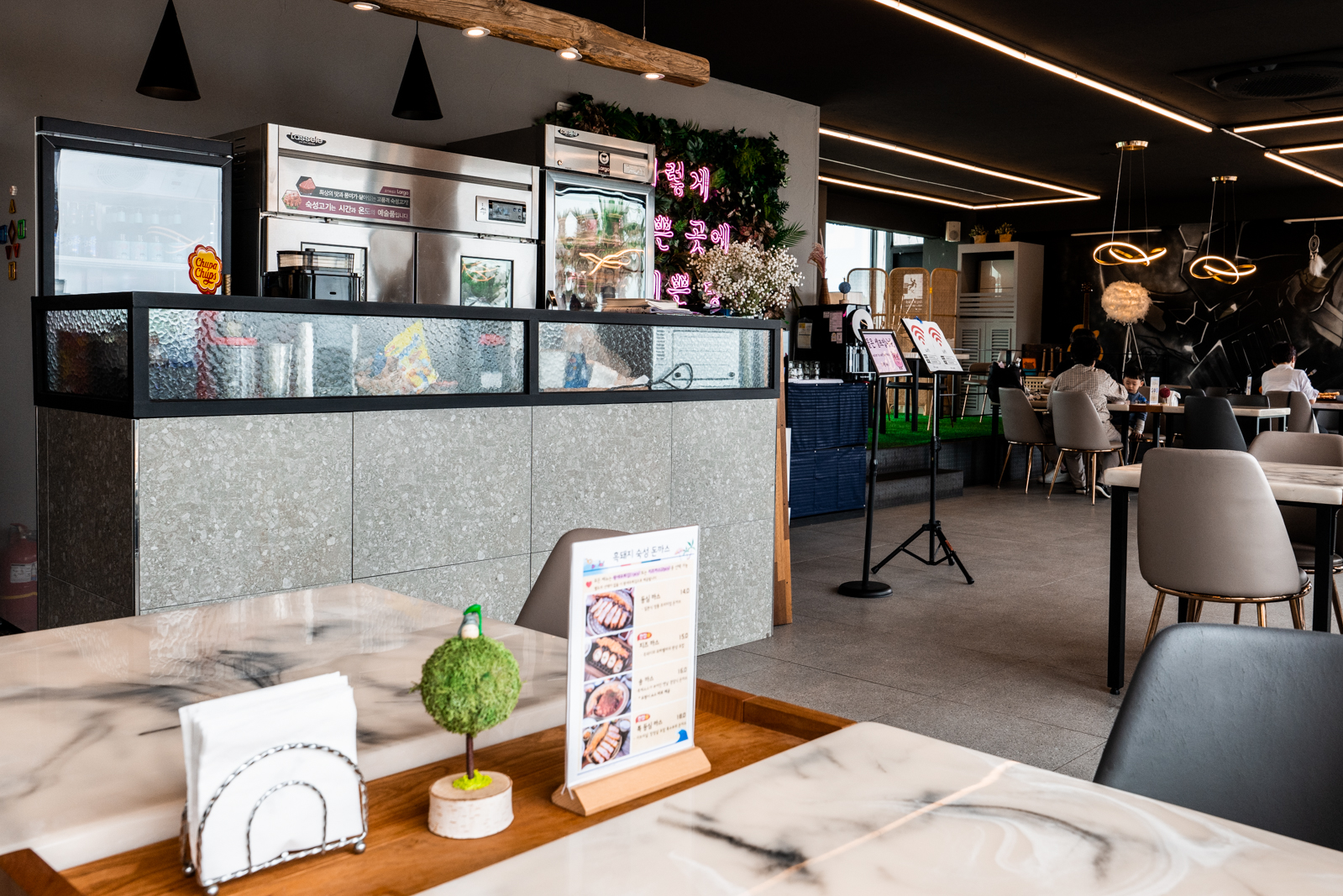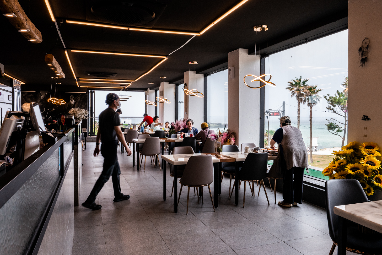 2층 매장 안으로 들어가면 4~6인이 앉을 수 있는 넓은 테이블을 여러 개 갖췄으며 안쪽에도 별도의 자리가 마련되어 있다. 어느 자리든 통유리를 통해 함덕해수욕장 오션뷰 전망을 볼 수 있다는 특징을 갖고 있다.