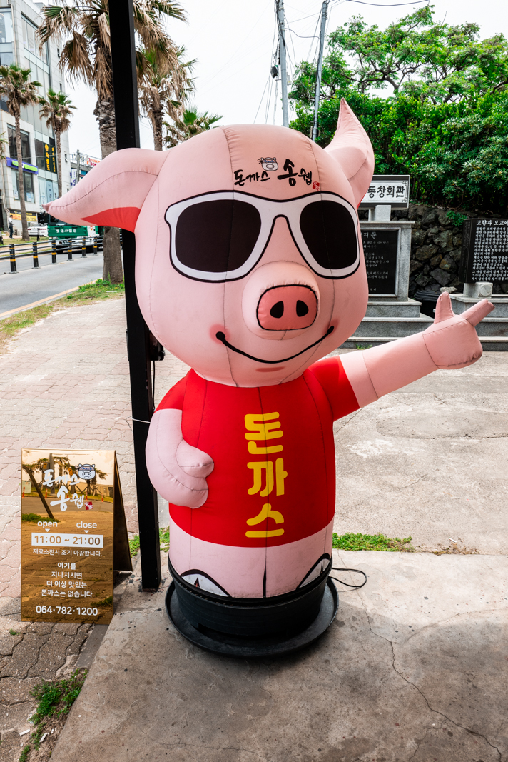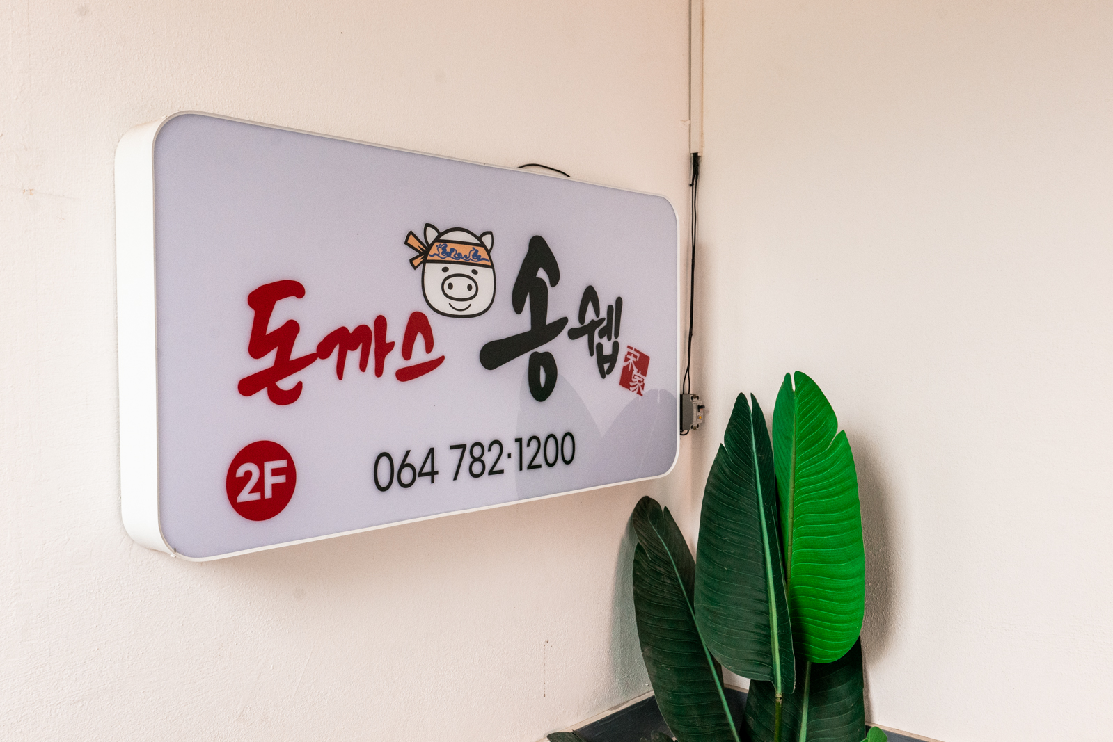 제주 함덕해수욕장 앞 도로에서 오드랑베이커리, 소노벨 제주로 방향으로 걸어가다보면 뜰채라는 횟집 2층에 돈까스송쉡가 자리잡고 있다. 선글라스를 쓴 돌하르방 풍선이 가리키고 있는 이곳은 매주 화요일을 제외한 오전 11시부터 오후 9시까지 운영된다. (브레이크 타임 : 오후 3시 30분~오후 5시)